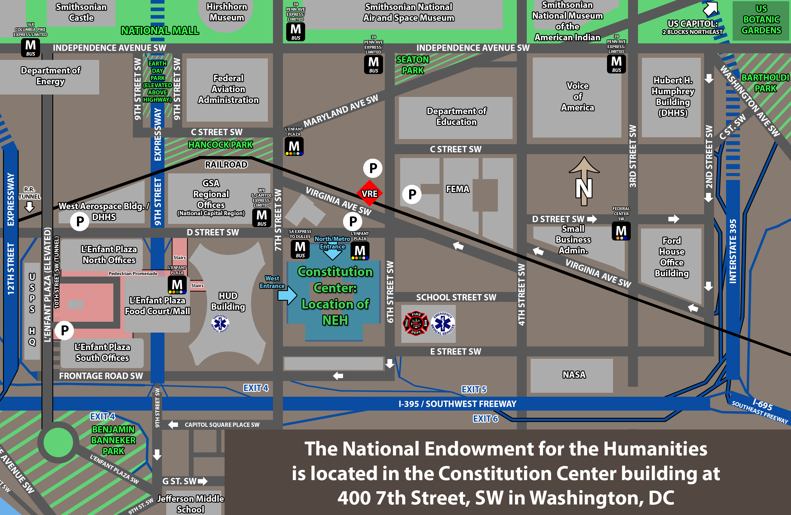 METRO NEH is conveniently located in the Constitution Center at 400 7th St. SW in Washington D.C. atop the L’Enfant Plaza Metrorail station, which is a stop on the Blue, Yellow, Orange, Green lines. Once in the L’Enfant Plaza station, follow signs for the 7th & D St. exit. Access to the Red line at Gallery Place is two stops away on the Yellow and Green lines, and Metro Center is three stops away on the Blue and Orange lines. A map of the Metro system is available here.