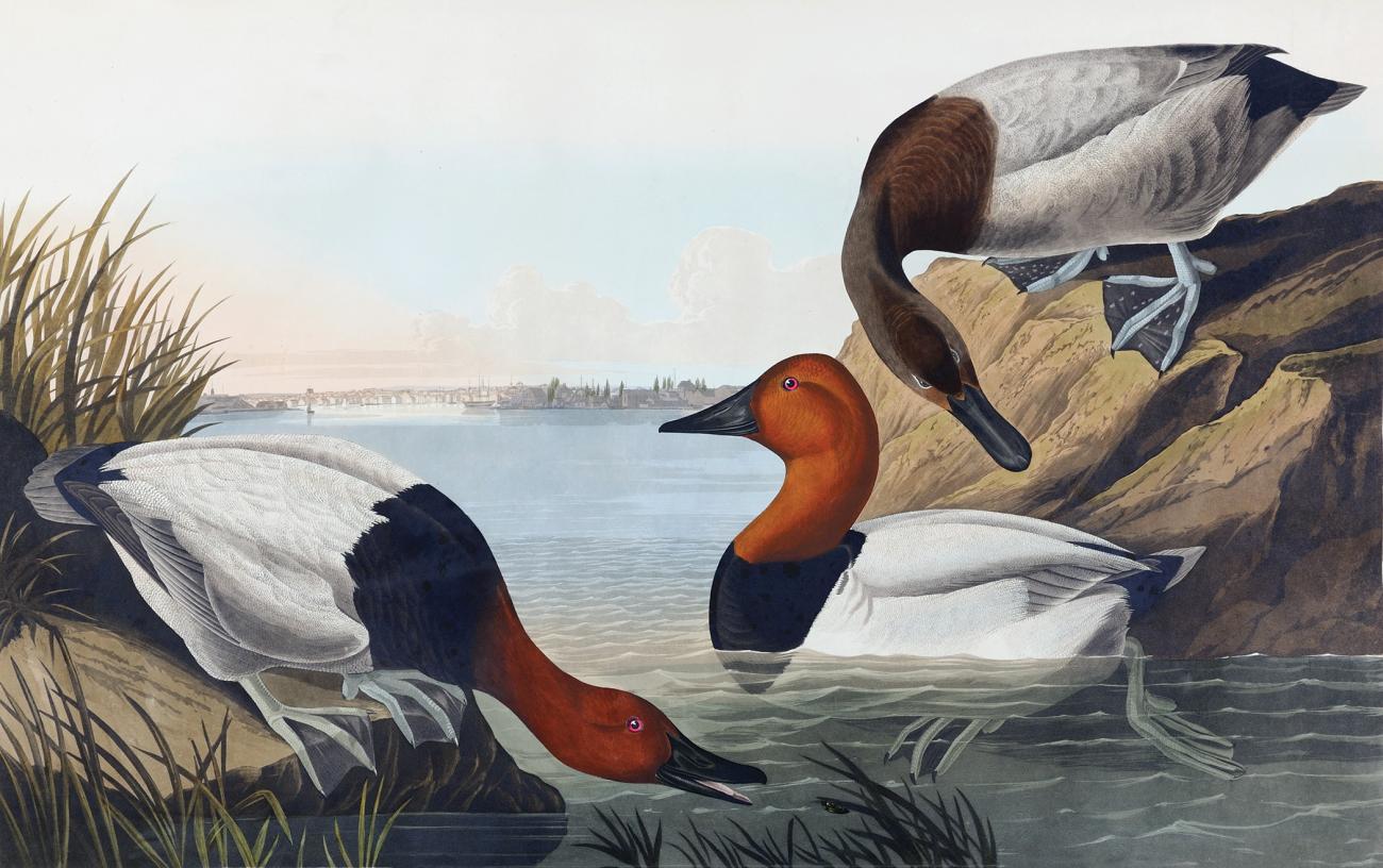 But the finished plate, in which Havell transformed the rough outline of a city into a miniature view of Baltimore, tells a different story. Here we don’t see tracheas or stomachs but living, breathing, swimming birds, a male and female positioned on the rocky ledges on the left and right, a male in the middle, drifting tranquilly in the wavy water. And just as we see the birds, the birds see us. Humans are both before and behind them—represented by those who view the plate and those who live in it (the residents of Baltimore). Again, Audubon substitutes for the human point of view the perspective of birds—birds that want nothing more than to be allowed to get on with the business of being birds. Audubon’s canvasbacks are the stately gatekeepers of a world that they know was never ours to share with them but always theirs to share with us—reminding the viewer of the enduring ecological edge of Audubon’s art.