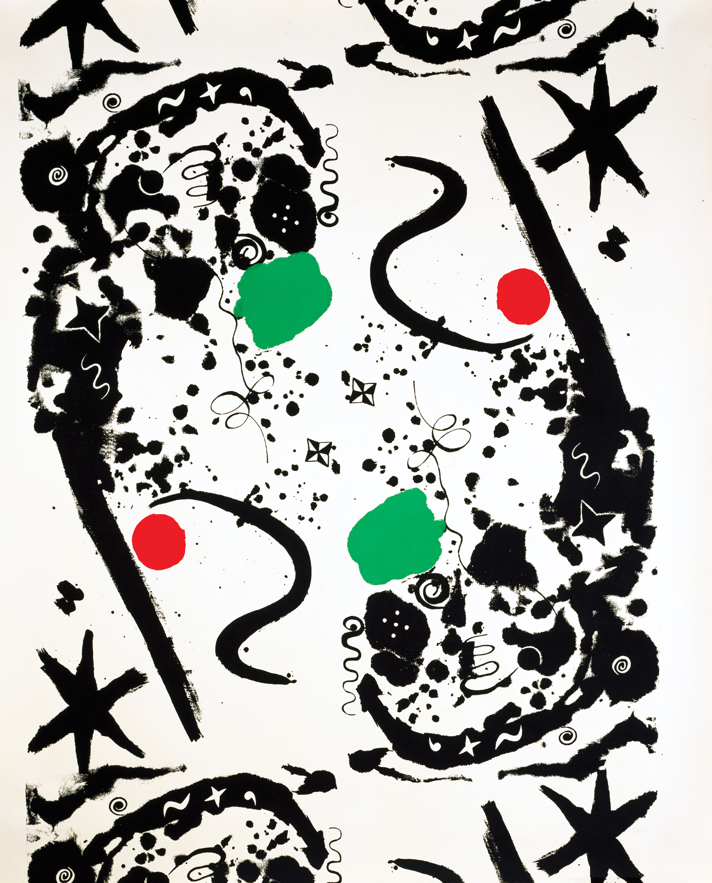 Alexander Calder produced this spirited composition with the fitting title Splotchy in 1949. Commissioned by interior designers Erwine and Estelle Laverne, Splotchy was one of two motifs the artist made for Laverne furniture textiles and wallpaper panels.