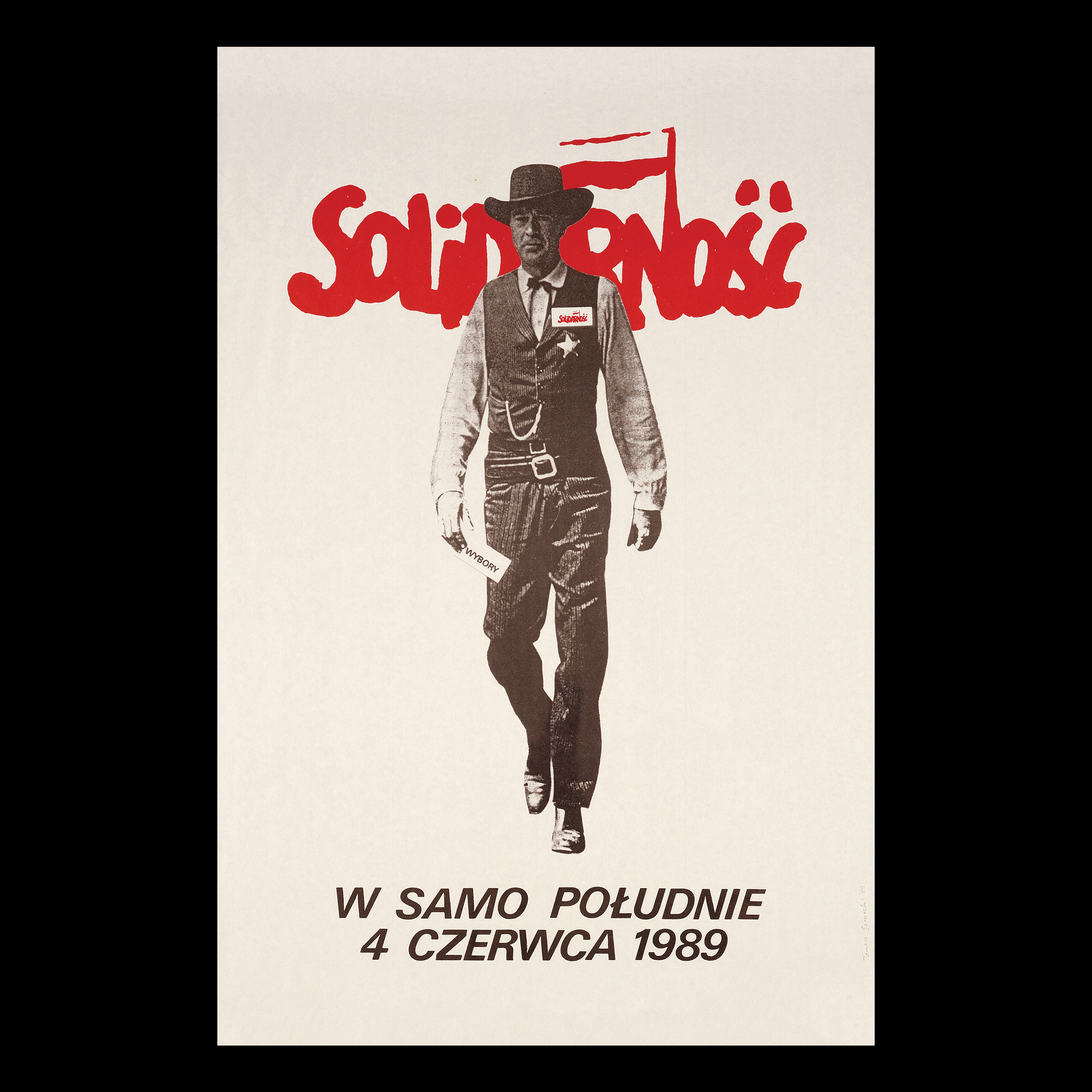 Though rooted in mid-century American politics, the fame of High Noon turned its protagonist into a global emblem of moral fortitude. For Tomasz Sarnecki, born in 1960s Poland, the honorable Kane resonated as a symbol of the fight against state socialism. In the lead-up to the June 1989 elections, Sarnecki, then a twenty-three-year-old design student, used the imagery of High Noon to urge Poles to vote the anti-communist Solidarność (“Solidarity”) ticket. In the center of the poster, Sarnecki reproduced an image of Cooper as Kane, placing a small badge above his marshal’s star and a ballot in his right hand. At the top of the poster, he placed the bold red Solidarność logo; at bottom, in black text, he inserted the call to action: “High Noon for Poland June 4, 1989.”