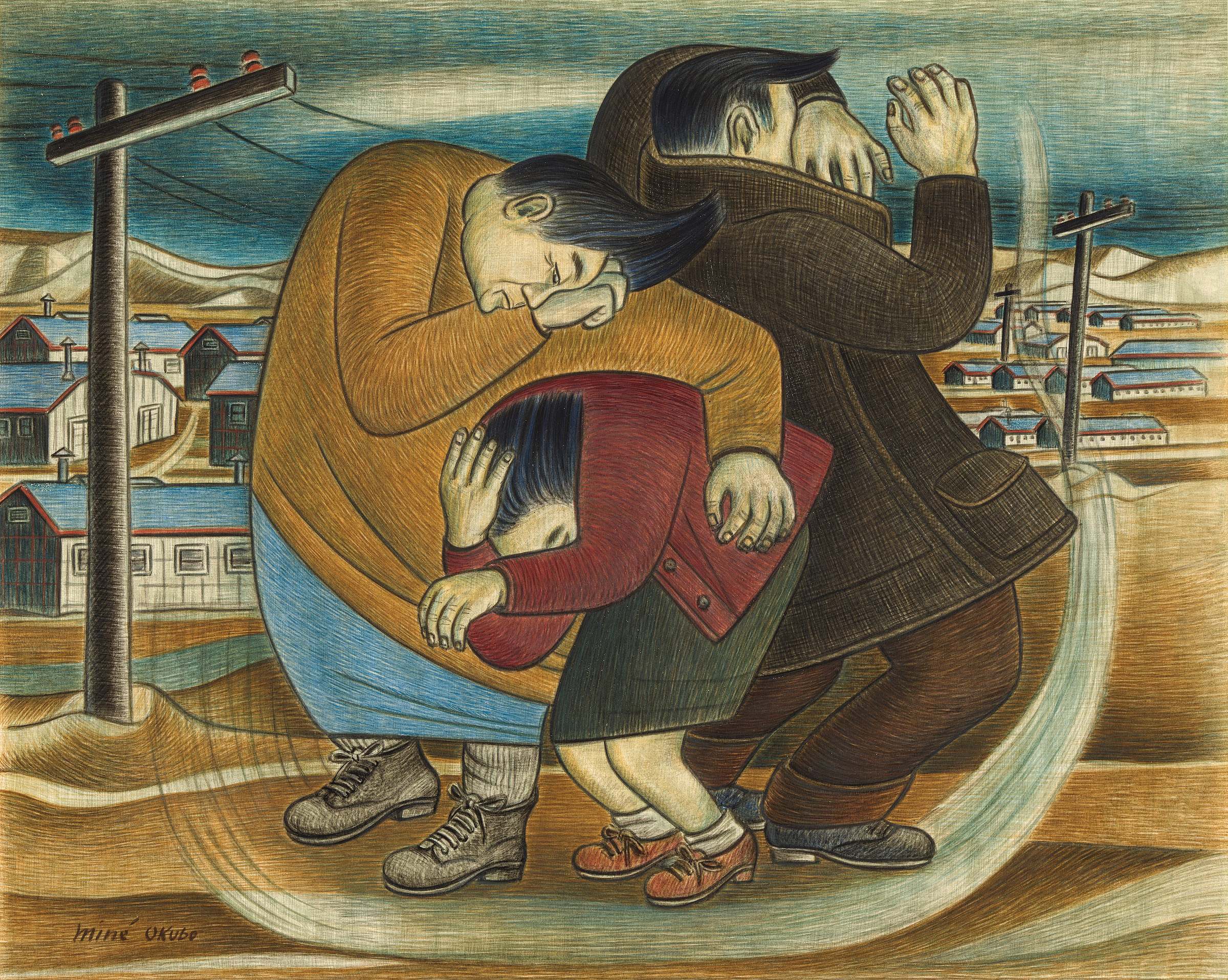 While still interned, she completed Wind and Dust, this watercolor on paperboard that hauntingly depicts the camps’ hopelessness. A family huddles to fend off a swirl of dust. Dozens of lookalike barracks extend behind them in a bleak, brown landscape. The 1943 painting is on display at the Smithsonian American Art Museum through August 2025, in an exhibition that honors three American female artists of Japanese descent.