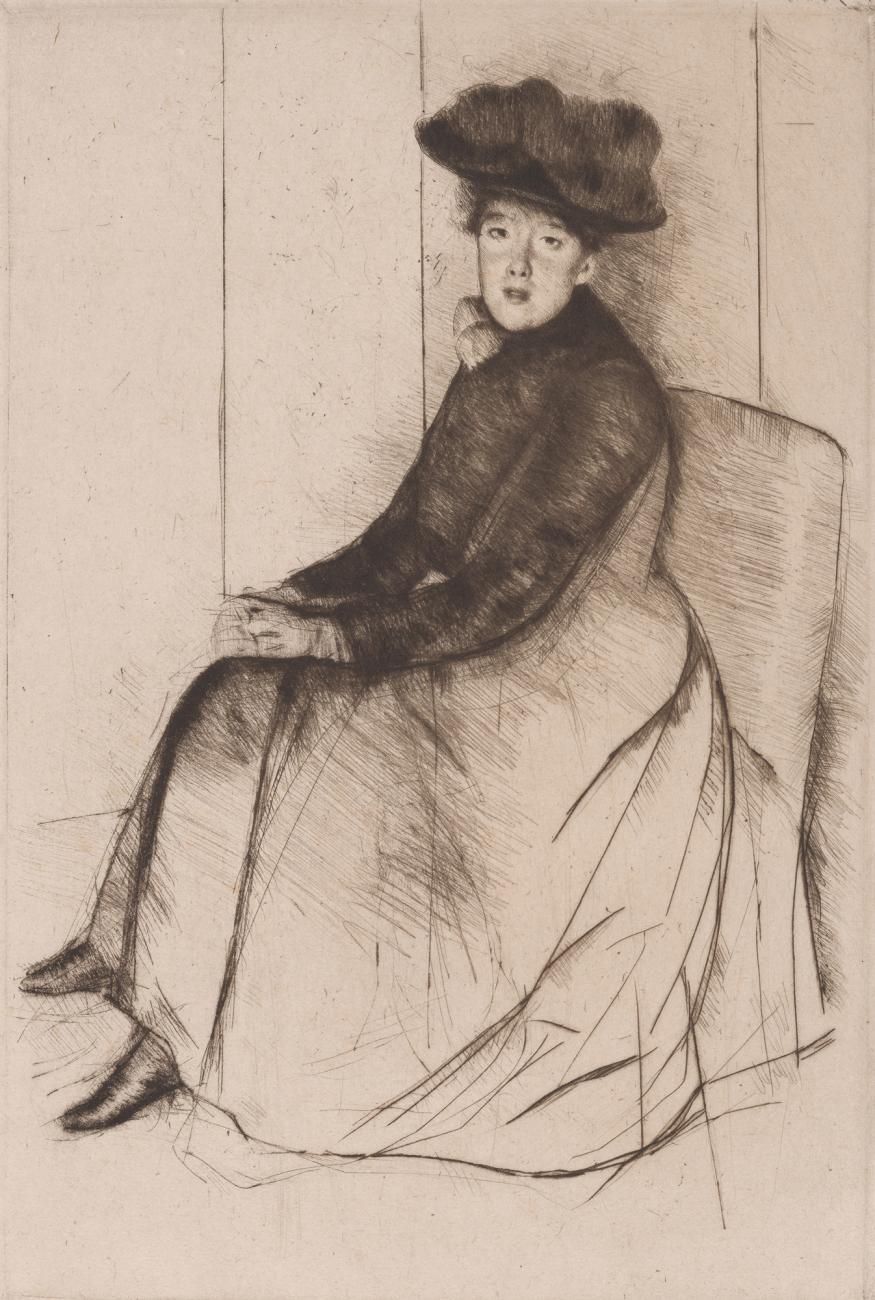What one should strive for, she pronounced, in 1909, is “superior art” and “a hidden personality.” But in the spare print Reflection, we get a glimpse of her. Seated, spine straight, hands folded in her lap, Cassatt looks out wistfully, as if waiting to speak. Rendered with sharp, spindly linework, she is transfixing, her stare bright under the shadowed flounce of her hat.