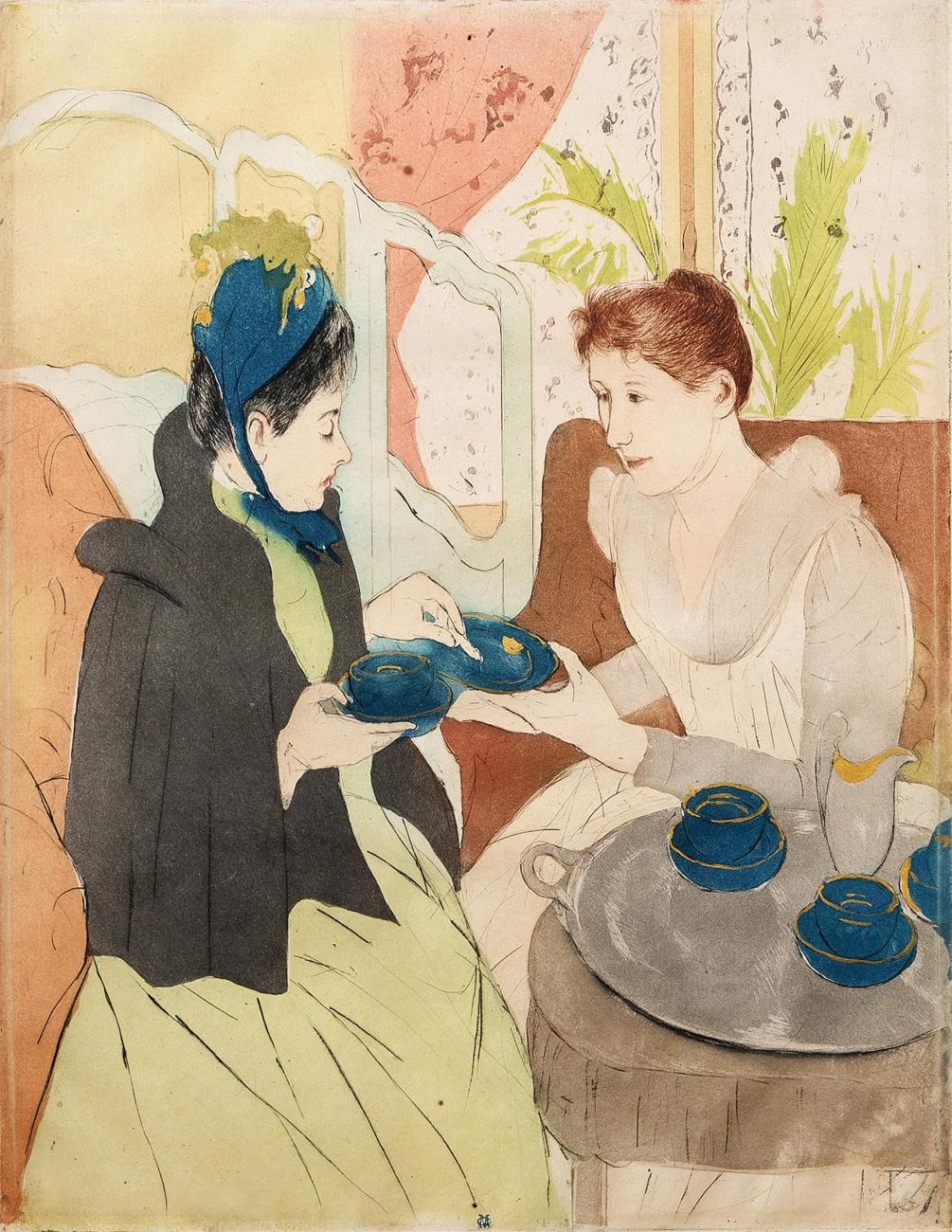 In her printmaking, she slows down. Spellbound by the Japanese woodcuts she saw in Paris, in 1890, Cassatt mused, “I dream of it and don’t think of anything else.” That year, she began etching on copper plates. The result: a set of ten impeccably colored pictures, “charged with meaning and tension,” says Garber. Arranged on a charcoal-gray wall in the galleries, each is a window into a woman’s life as it is happening. In one, a figure seals an envelope, her exquisite brocade dress patterned with cobalt blues. In another, a woman is at a fitting, the stripes of her dust-pink gown echoing her seamstress’s rumpled frock. Cassatt relished the details: the graceful cut of a skirt, the supple lines of a hand. Picturing a woman bathing a baby, Cassatt lingers on her lemon-yellow dress, dotted with black, tendril-like branches. That many of her figures were not mothers, but paid models, only adds to Cassatt’s artistry. She didn’t just see women, she staged them, each caress timed to perfection. When a pair of women sit down to tea, Cassatt leans one forward, intently, while the other, still in her coat, anticipates her getaway.