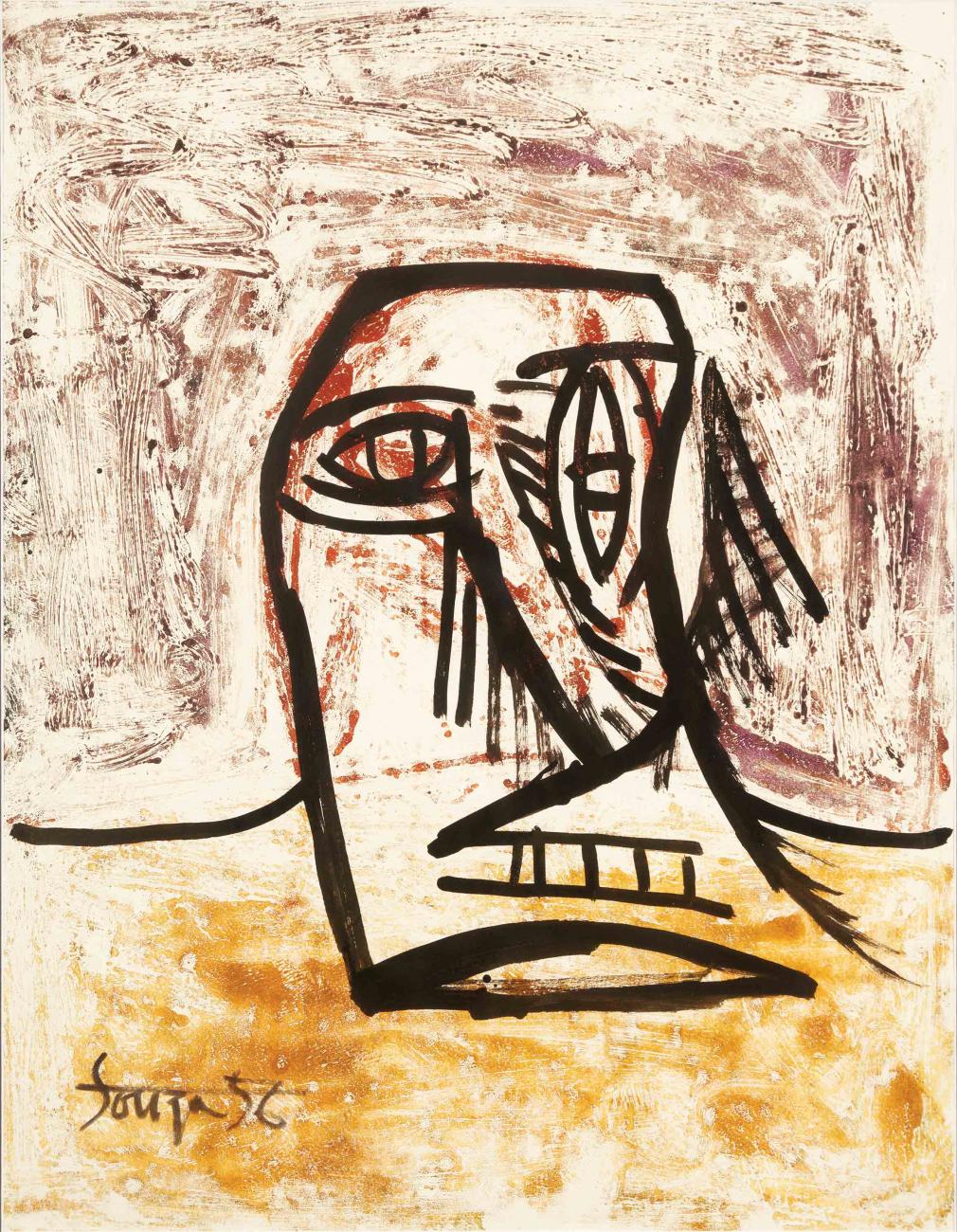 Lawrence traveled to Nigeria, the first time, to close an exhibition of 25 panels from his Migration series. It was a short stay of ten days, but Lawrence would return in 1964 with his wife, Gwendolyn Knight Lawrence, for a longer eight-month sabbatical. His second trip would prove more fraught but also fruitful. The FBI had opened a file on Lawrence in 1953, identifying him as a security risk with links to the Communist party. This surveillance left him unable to receive State Department funding for his trip, and Nigerian and American authorities made the first month of their stay difficult. Quoted in Over the Line: The Art and Life of Jacob Lawrence, Gwendolyn Knight Lawrence recalled that the local governments were wary of the Lawrences, believing they had a relationship with the authorities, while those same agencies were making it difficult for them to secure housing. The pressure eventually relented, and Lawrence went on, with Gwendolyn, to give lectures and conduct workshops in Ibadan with the Mbari Club and also with Mbari Mbayo, the Osogbo-based group 60 miles away. The historical record is sparse, and Lawrence left little commentary about his time in Africa, but there is no doubt the connection was significant for him. He returned to Nigeria, selling his Brooklyn apartment to do so. The works he created there also demonstrate the impact Nigeria and its people had on his practice.