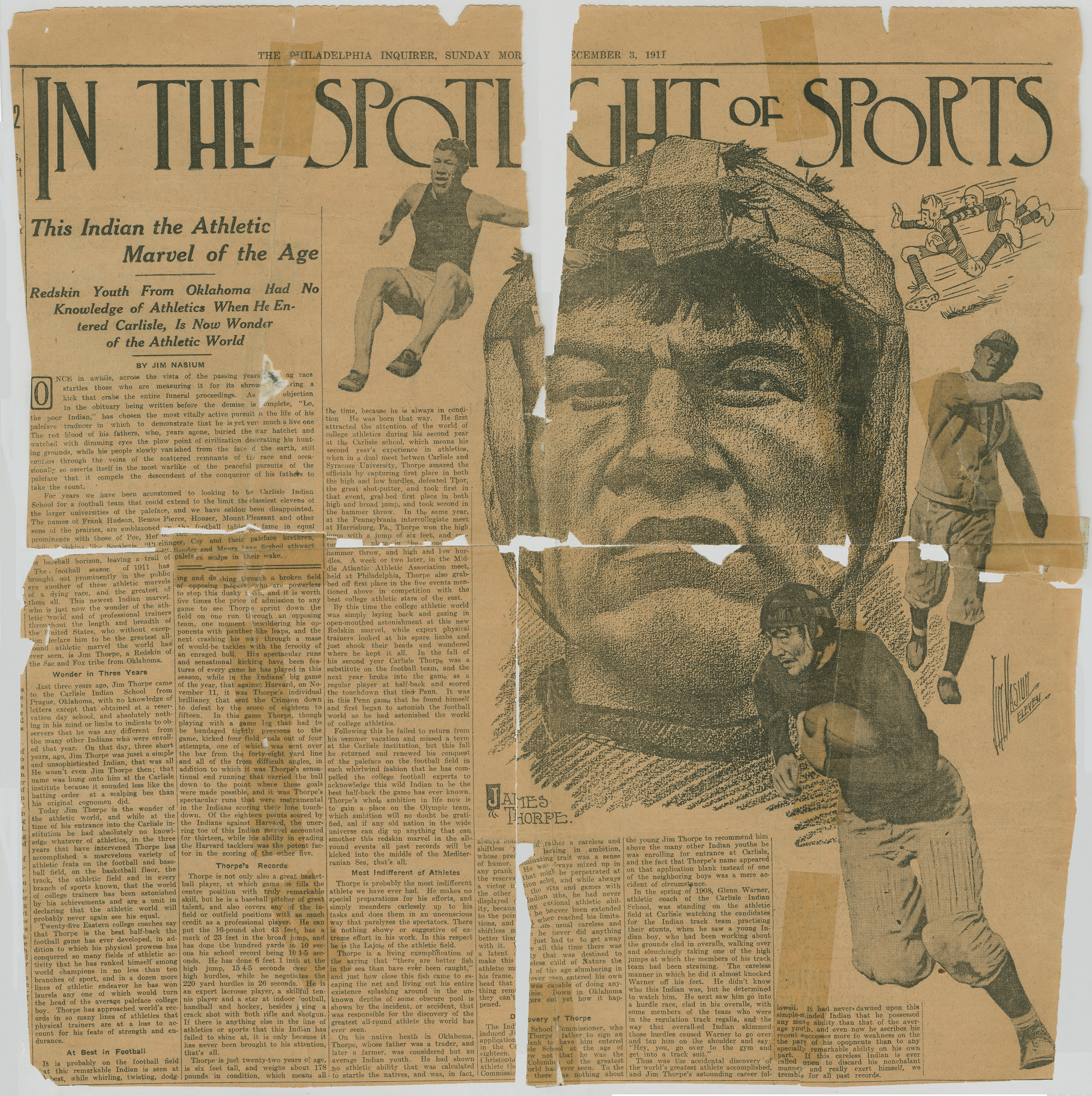 Five illustrations from a 1911 Philadelphia Inquirer article portray a robust Jim Thorpe (also known as Wa-Tho-Huk) in his athletic prime, countering prevalent beliefs that Euro-Americans had about Indigenous people at the time: that we were a people near extinction.