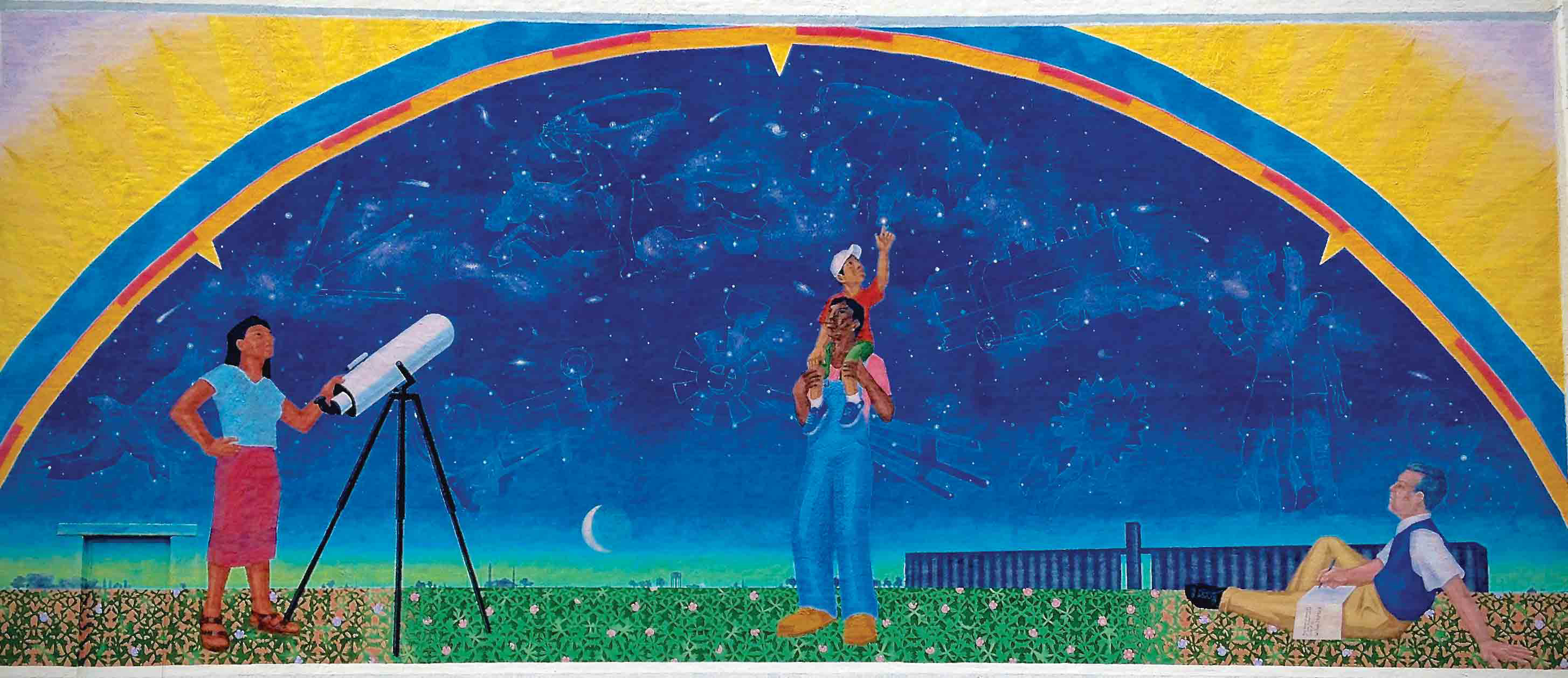 The work, called Ad Astra, depicts various people observing constellations. When the assembled local artists realized they didn’t know very many constellations, they gave themselves permission to create their own.