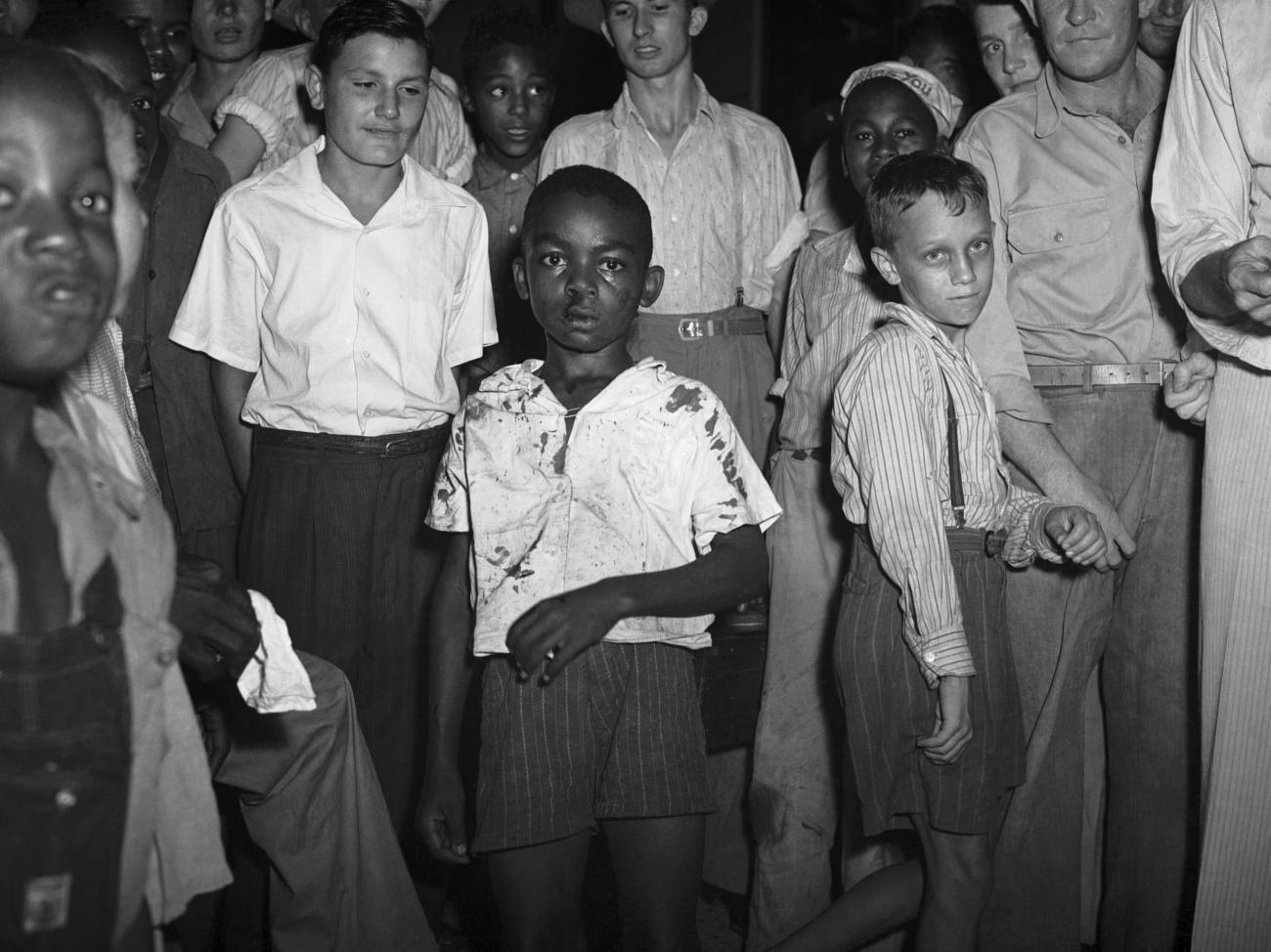The men had been accused of harassing a white woman. Their bodies hung for hours as people gawked. Most chillingly, a white man crouches, clutching the lynched men’s trousers so they don’t swing and make Pruitt’s slow exposure photograph blurry. The photo was used in the Black-owned newspaper the Chicago Defender and printed on postcards, even though the latter was made illegal in 1908. No one was ever charged in the murder.