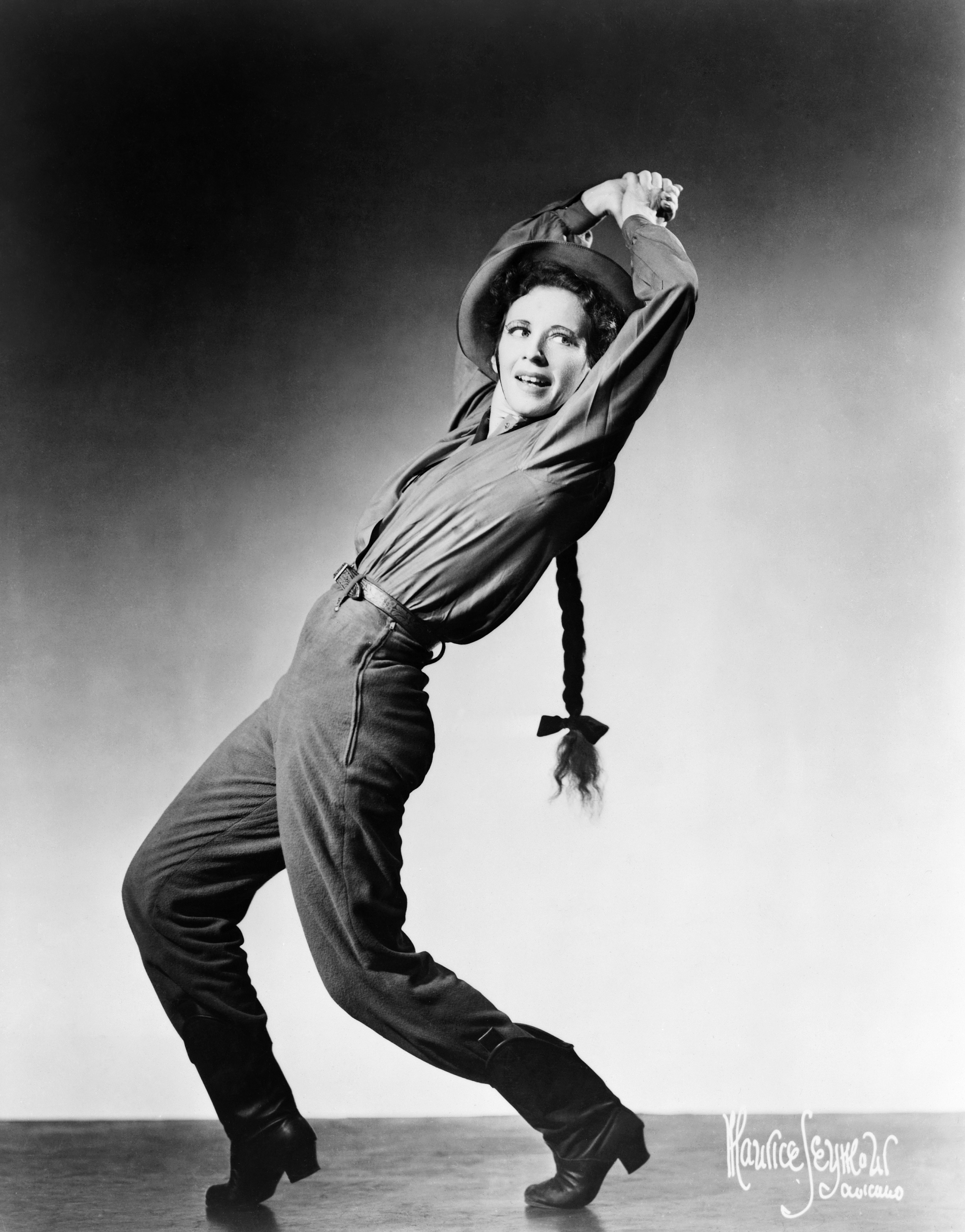 Rodeo tells a simple tale of a rambunctious cowgirl who swaps her cowboy boots for a dress to win the attention of a handsome but haughty head wrangler, only to opt for romance with a kindly champion roper instead. The heroine’s happy ending doesn’t come without heartache, an emotion de Mille knew all too well as the daughter of screenwriter William de Mille, who, she told a friend, would have preferred a son and a tennis player rather than a daughter and a dancer. On the bright side, it was the silent film careers of William and his director brother, Cecil B., that exposed Agnes to the intricacies of storytelling. While visiting the sets of their movies, de Mille witnessed how actors communicated using only their faces and bodies as they were burned at the stake or tossed to the lions. She grasped this nonverbal language intuitively and applied it to dancing, creating her own choreographic lexicon. In Rodeo, for example, cowboys swirl unseen lassos in unison to signal their exuberant dominance over the land and the dainty maidens who prance before them in rows with their hands clasped. In turn, the cowgirl shrugs, wipes her nose, and falls to the ground, in tandem with no one. De Mille insisted on playing this misfit herself on opening night. “When I was onstage, it mattered to me,” she recalled. “That girl was fighting for her happiness.”
