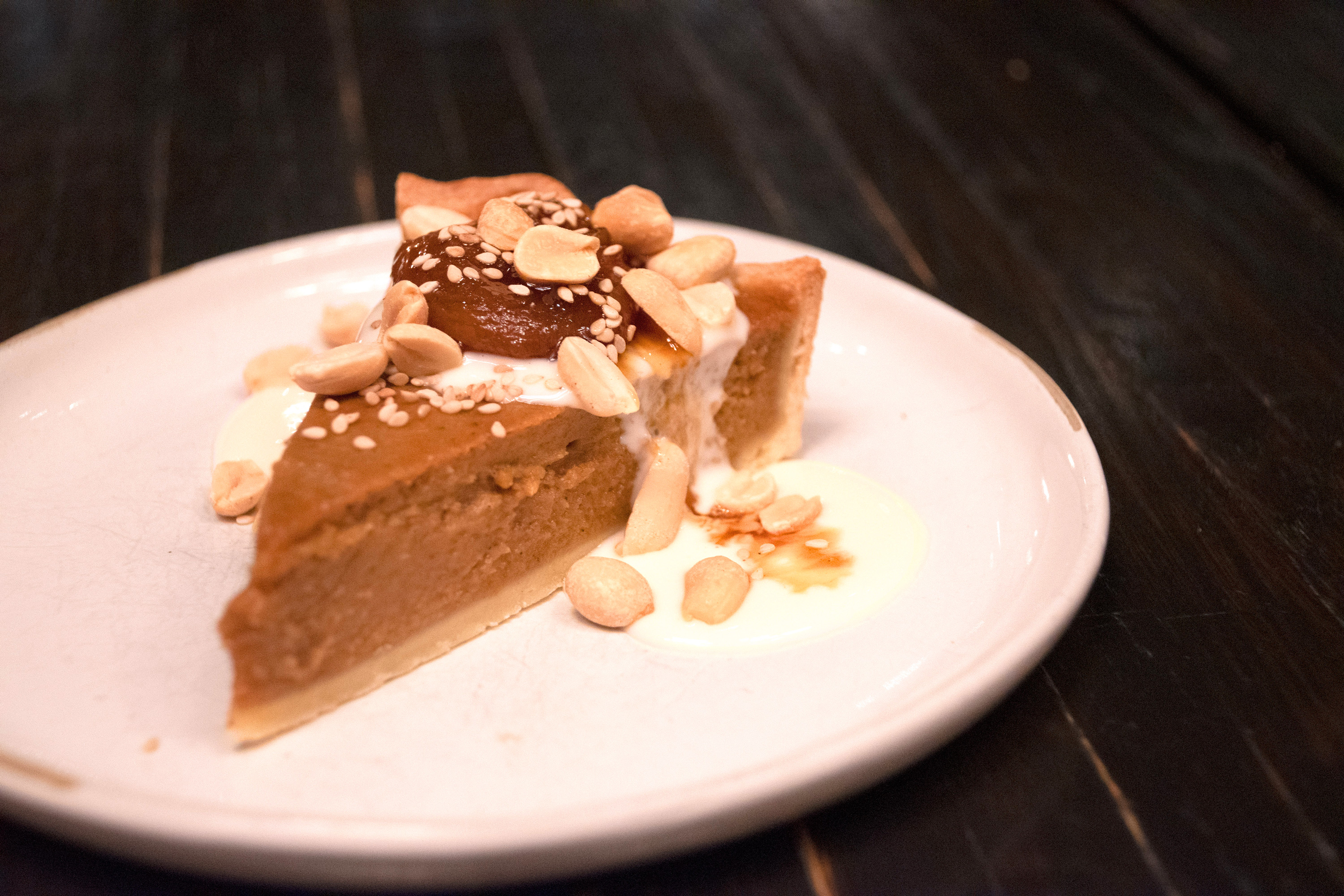 Finishing my meal at Benne, I ordered Daisy Mae’s sweet potato pie. The slice delivered by the waiter could have been pulled directly from the dreamlike nostalgia of Wayne Thiebaud’s dessert paintings. A perfect wedge of sweet potato custard on browned crust, sprinkled with peanuts and benne seeds. Fragrant notes of nutmeg and allspice are threaded into the silky sweet potato puree. It’s creamy and earthbound, and more than a touch reserved in its sweetness. Without knowing the backstory, its taste seems ancestral, continued from a place of love and respect. As it turns out, the recipe is a tribute to chef Hethington’s grandmother, who always brought her famous sweet potato pie to family gatherings before her passing in 2019.