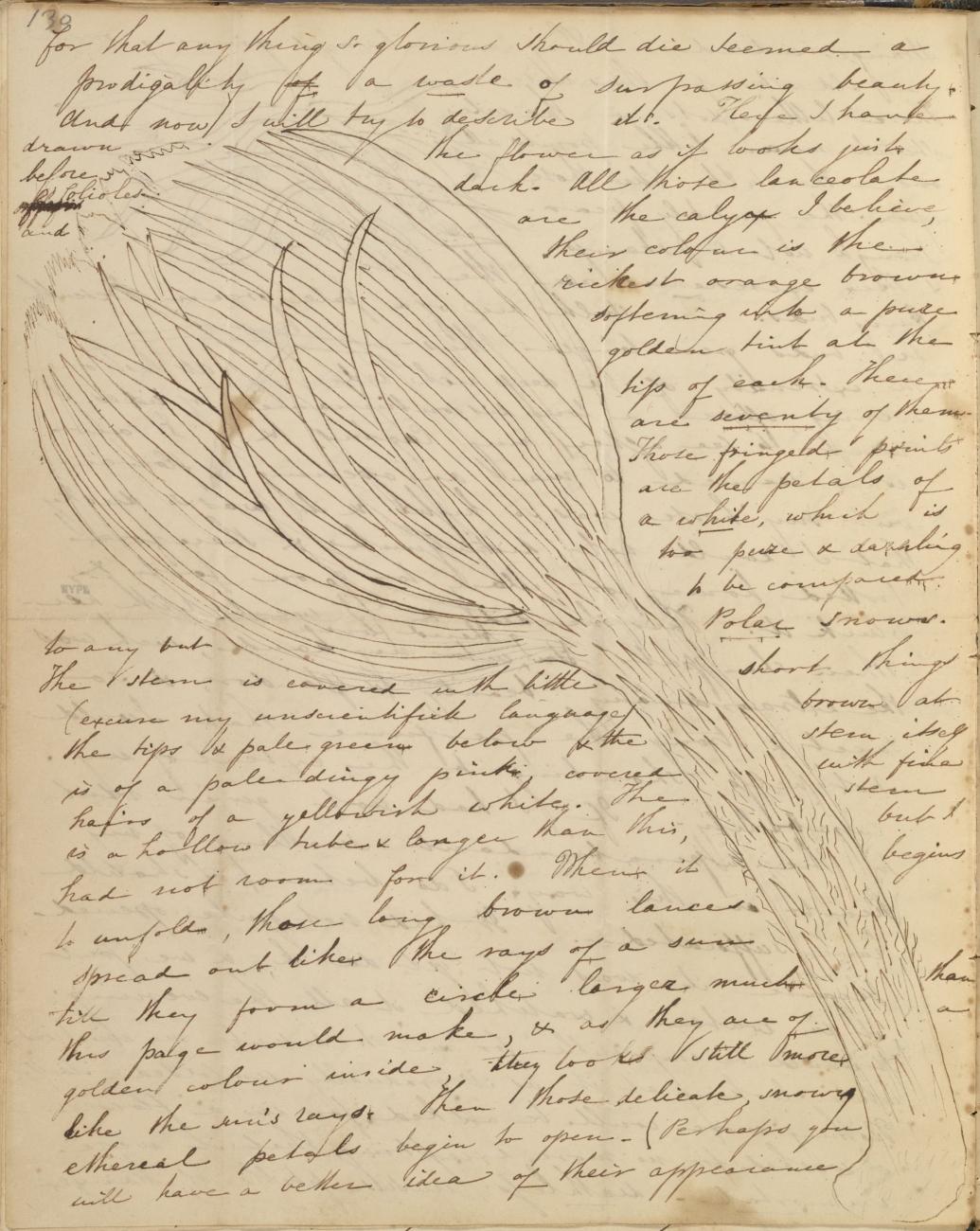 “When she put the gathered flowers into my hand, such was the extraordinary beauty & splendor, & so sweet & strong the perfume that I could not help shouting to the extent of my capability—If I had not given vent to the superabundant swelling of my heart in this way—I do believe I should have suffocated.” It was a moment of Keatsian rapture: the perfection of the flower’s beauty counterpoised by its tragic impermanence, and both blended in a powerful aesthetic experience. “Nothing more could be asked of a flower—I wished for no more excepting that it were immortal—deathless, unsusceptible of change for that any thing so glorious should die seemed a prodigality of waste of surpassing beauty.”