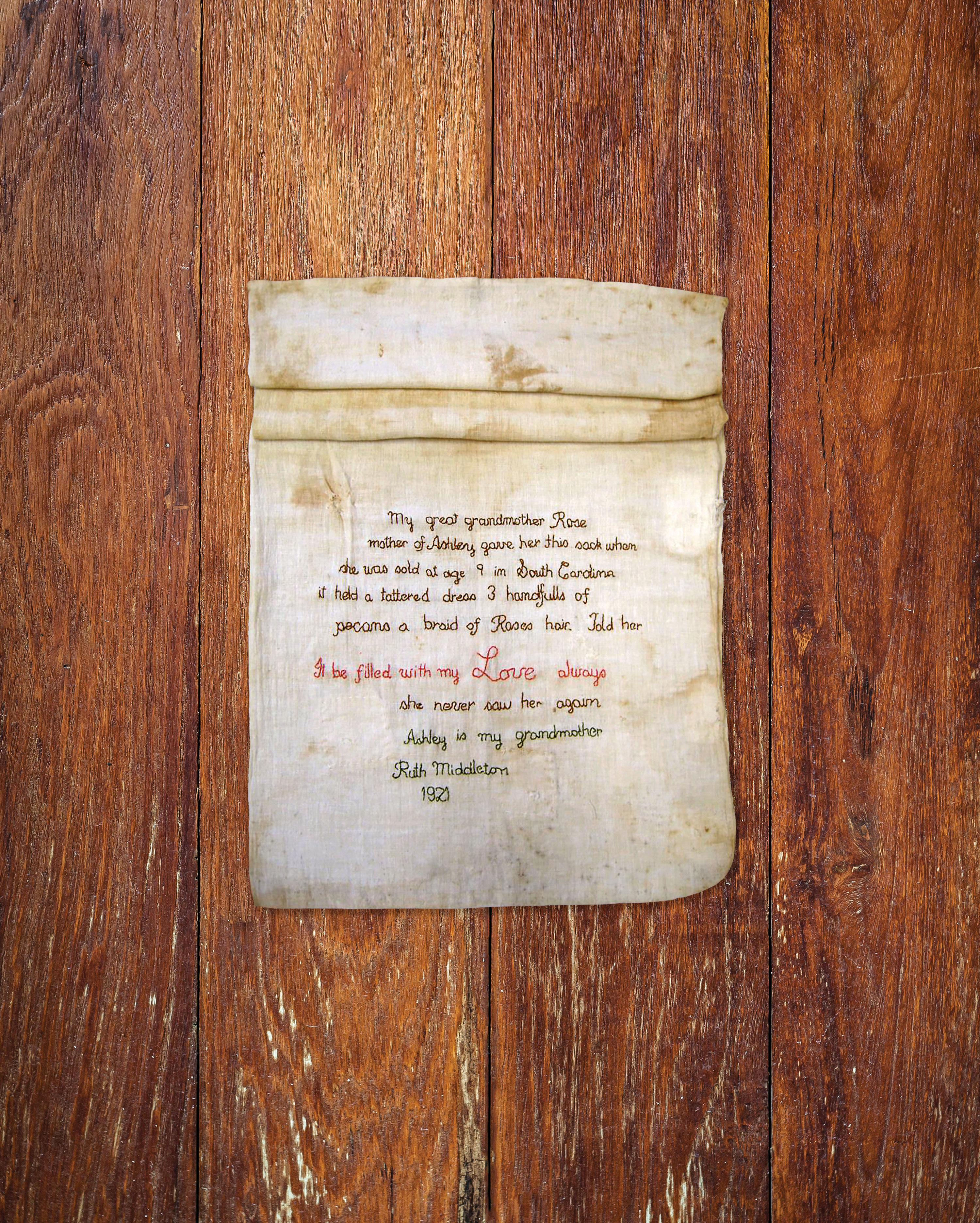 I link the eviction to the quilt because of the heroine they have in common. In the case of Ashley’s sack, the attachment is even more material. That story from the past is sewn directly onto the fabric. As the oft-quoted scholar of U.S. women’s history Laurel Thatcher Ulrich recounts in her book The Age of Homespun, folks in the eighteenth and nineteenth centuries sometimes affixed stories to objects, tucking fragments of paper about origins or events from the times into woven baskets, or pinning information about an object’s owner onto the heels of woolen stockings, or even painting wordy descriptions onto wooden chests of drawers. This impulse to preserve past knowledge by hitching narrative explanation to items exhibits what Ulrich calls the “mnemonic power of goods.” Things become bearers of memory and information, especially when enhanced by stories that expand their capacity to carry meaning. And if those things are textiles, stories about women’s lives seem to adhere with special tenacity, even as fabrics, because of their vulnerability to deterioration and frequent lack of attribution to a maker, have been among the last kinds of materials that historians look to in order to understand what has occurred, how, and why.