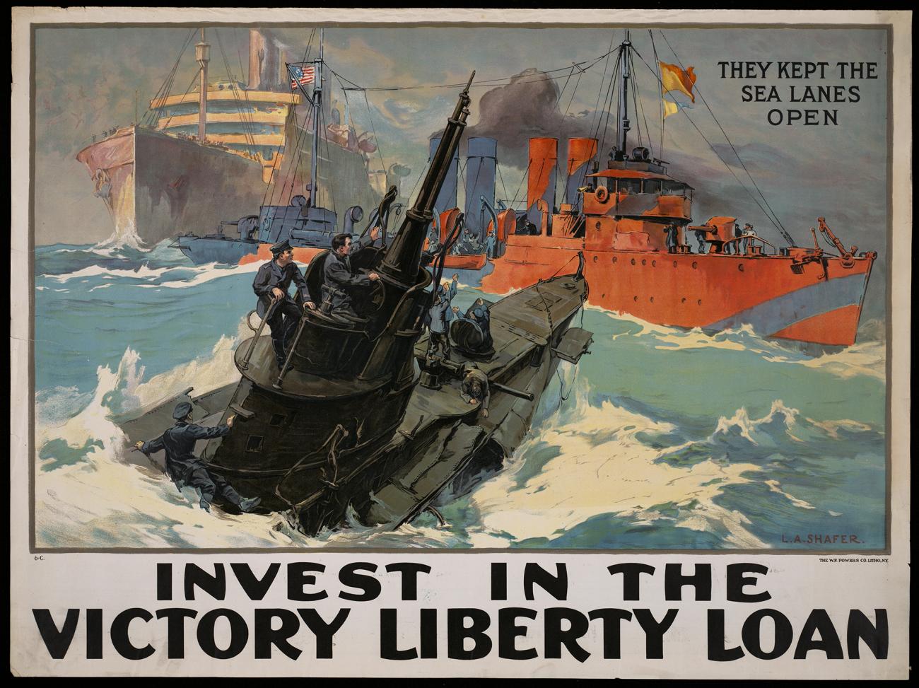 Almost two-thirds of the cost of the war was financed through four Liberty Loan Campaigns. Approximately 20 million people owned at least one bond.[1] A fifth campaign—the “Victory Liberty Loan” —was issued on April 21, 1919, to pay off additional war debt. Bonds were sold a number of ways, including door-to-door by boy and girl scouts and in huts on town squares. They were advertised, like former loan campaigns, with evocative posters of bandaged up but triumphant soldiers, dazzle painted ships upending German submarines, and the patriotic figure Columbia appealing for unity in the ever-present debates over immigration and assimilation.