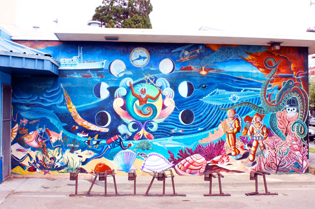 “The Primal Sea,” painted 1980, Susan Cervantes in collaboration with the community, Garfield Square/Pool. All mural images can be found at precitaeyes.org.