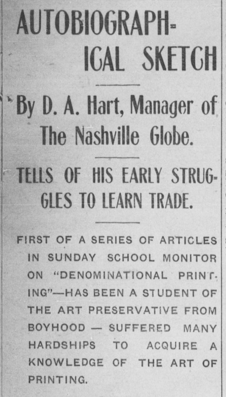 This piece tells of Hart’s career in the newspaper trade, and the Nashville Tribune, where Hart’s career began in the 1890s. There are only two issues of this paper listed in the U.S. Newspaper Directory, one from 1890 and one from 1891. However, another source (Brown, 1982) cites the Nashville Tribune’s publishing dates as 1912–13. A further search of the Nashville Globe reveals a story printed in the November 1, 1912, issue in which the Tribune is mentioned, along with its office location in the Johnson Building and its managing editor W. H. Young. As there are no extant copies of the paper from this time, there is no record of it in the U.S. Newspaper Directory.