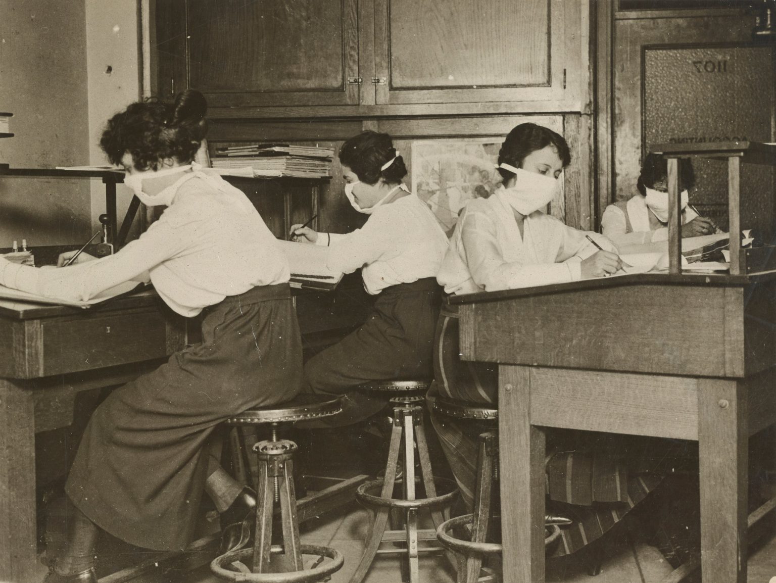 Mask for Protection Against Influenza: Girl clerks in New York at work with masks carefully tied about their faces. (October 16, 1918).