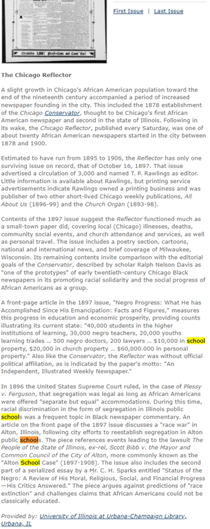 We can also examine which title essays fell under each topic cluster. Close reading of the title essays within topics can be a great starting point for further historical inquiry. For example, I was interested in the appearance of “schools” in topic #2. After reading several title essays grouped under this topic, I saw that a large proportion of title essays for African American presses include sections about Black schools (Athens Republique), segregation in schools (Chicago Reflector), and Baptist schools (American Baptist).