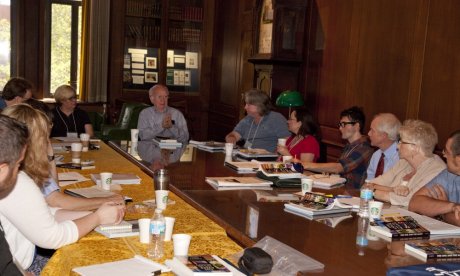 Martin E. Marty, Professor Emeritus at the University of Chicago, leads a discussion with community college faculty at the Newberry Library as part of the "Out of Many" project.