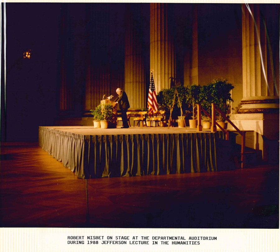 Robert Nisbet, the seventeenth Jefferson lecturer, giving his lecture, “The Present Age.” This picture is a part of the 1988 Jefferson Lecture scrapbook. Nisbet, a sociologist and historian who taught for forty-two years, was also the author of over twenty books.