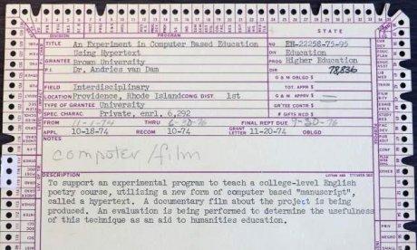 We became aware of the project and the film during our efforts to digitize NEH’s grant records from 1965 through 1979 which were filed on McBee Keysort Cards (please read about the project here and here and here). This particular McBee card caught our attention for its surprising use of hypertext in literary studies in 1974, long before hypertext underpinned the internet as we know it. Since its discovery we have always been curious about the film that was one of the “project deliverables.” Brett Bobley, Director of ODH, contacted Professor van Dam, who still had a copy—the only copy—of the film. Professor van Dam was gracious enough to share it with us, as well as attend the screening, and share his experience and expertise in a panel discussion following.