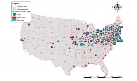 This map of railroad workers in 1880 reveals what U.S. census data failed to capture: that in addition to official railway employees, thousands more were employed in railroad “shops” as machinists, tinners, boilermakers, blacksmiths, and helpers. It is the product of one of the Digging into Data projects reviewed by the Council on Library and Information Resources.