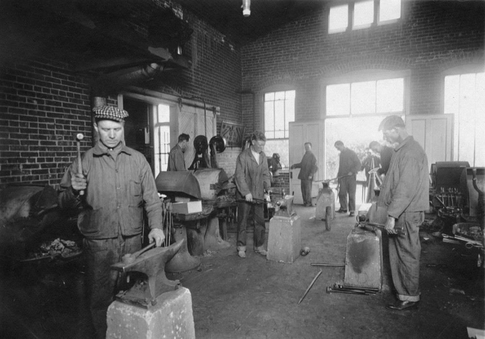 World War I veterans in class in the first forge shop, Idaho Technical Institute (now, Idaho State University), 1920.