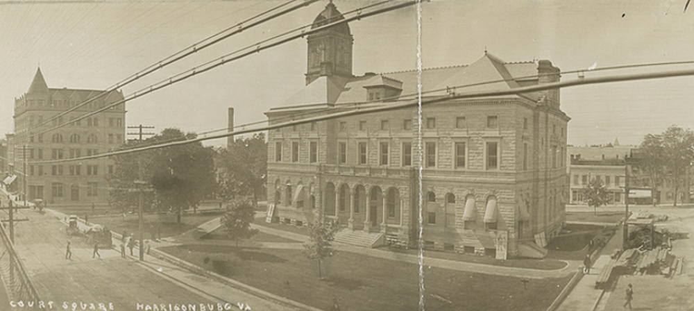 Postcard showing Rockingham County courthouse and surrounding buildings in Harrisonburg, Virginia.