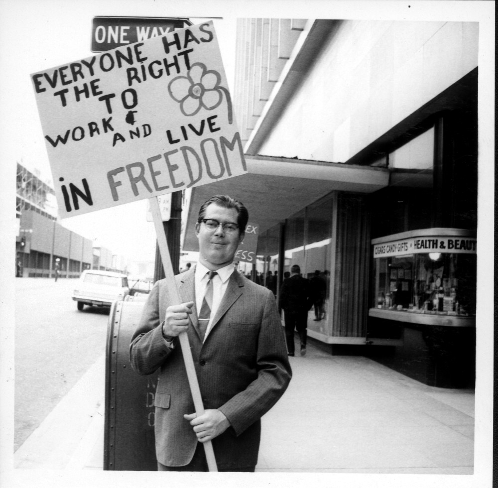 Demonstrator outside the State Steamship Lines, circa May 1969, during an event organized by Troy Perry and Jim Kepner.