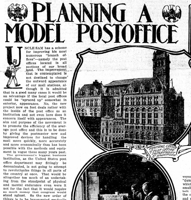 The post office was completed in 1899 and became the first government building to have its own power plant. From the newspaper reports, we can glean tantalizing clues about the postal service’s operations at the turn of the century. For example, an office on the second floor intercepted letters addressed to the deceased. An estimated $100 a day in cash and much more in money orders and bonds was reportedly confiscated by the Dead Letter Office, which made every effort to return money to the sender, with the remaining balance going to the U.S. Treasury. The department acquired so many volumes of books and magazines in the process, in fact, that it opened a functioning library!
