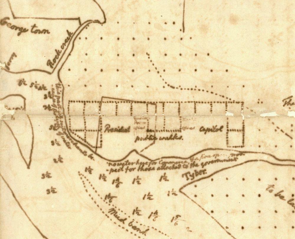 On March 31, 1791, Jefferson drew this map of his ideas for the new federal district. He sketched the layout of the Mall with the words "President, public walks, Capitol." Georgetown and Rock Creek are marked at the top left.