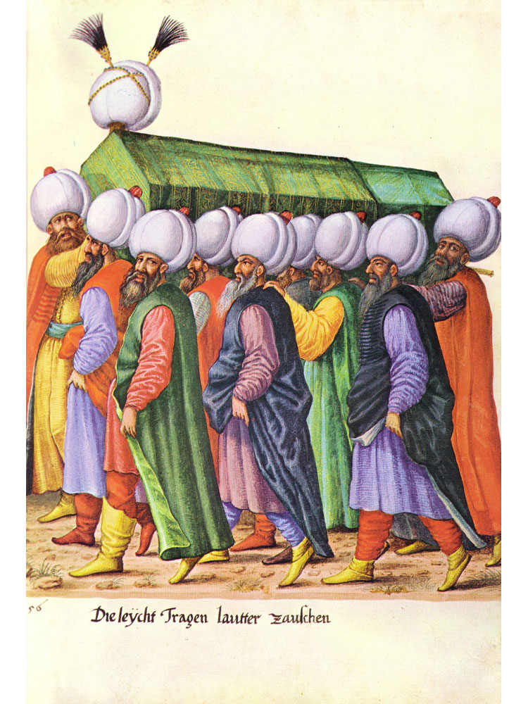 Marchers in Algiers convey a body to its grave in the 16th Century. Public ceremonies were segregated by sex. Pride of place in this man's funeral march went to his turban.