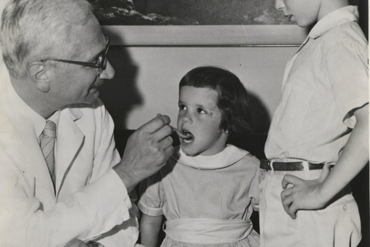 Dr. Sabin administers his oral vaccine to two Cincinnati children, ca. 1960.