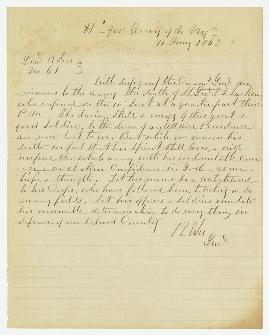 In General Orders No. 61, Lee announces the death of Stonewall Jackson, 1863.