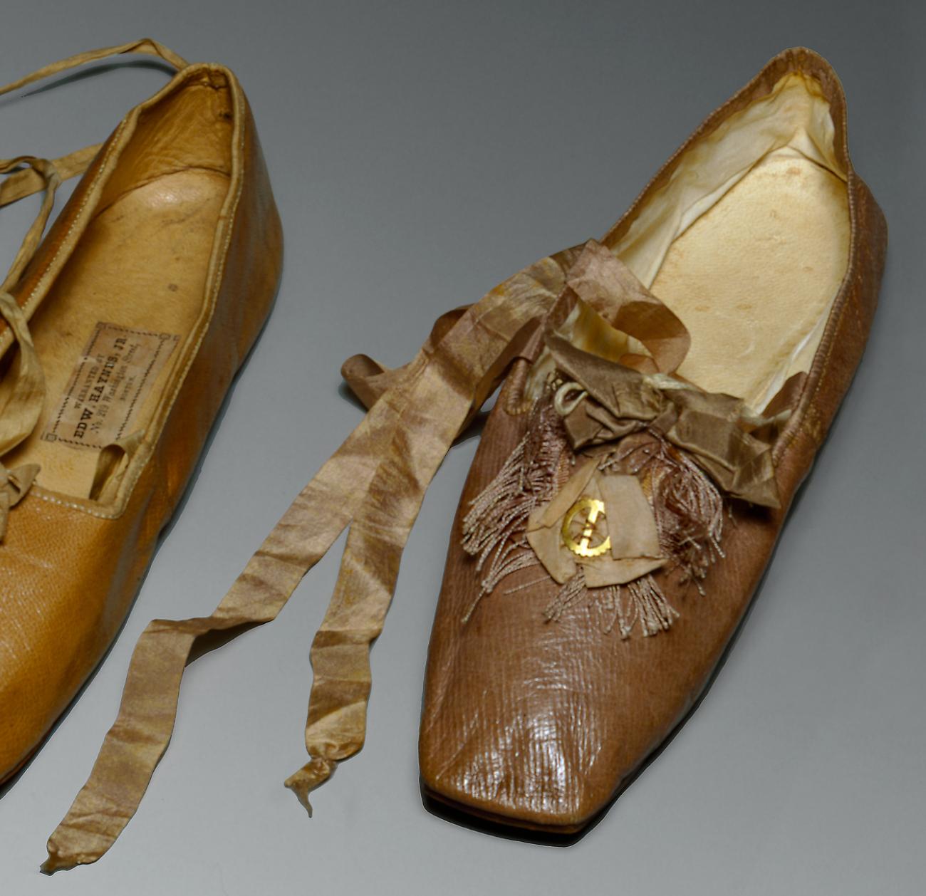 Preserved at the Peabody Essex Museum in Salem, Massachusetts, is a small box, only six inches by ten, and three inches deep, covered with white satin and mounted with a hinged glass lid. Beneath the fastening, stamped in gold, are the initials “C. F. W.” and a date, “Sept. 1, 1858.” The inside is divided into two compartments, also lined with white satin, and laid in these like Snow White in her glass coffin, are a pair of dainty white satin shoes with rosettes of papery silk, worn but once. Their thin satin uppers are lined with linen and only barely stiffened round the back, and a long narrow flimsy ribbon is attached to each side, meant to cross and tie round the wearer’s slender ankle. The soles, no thicker than thin cardboard, are only two inches wide at the widest point, and there are no heels at all. This frail footwear belonged to Caroline Frances Fitz of Ipswich, Massachusetts, and was worn at her marriage to Joseph Wheeler Woods in 1858.