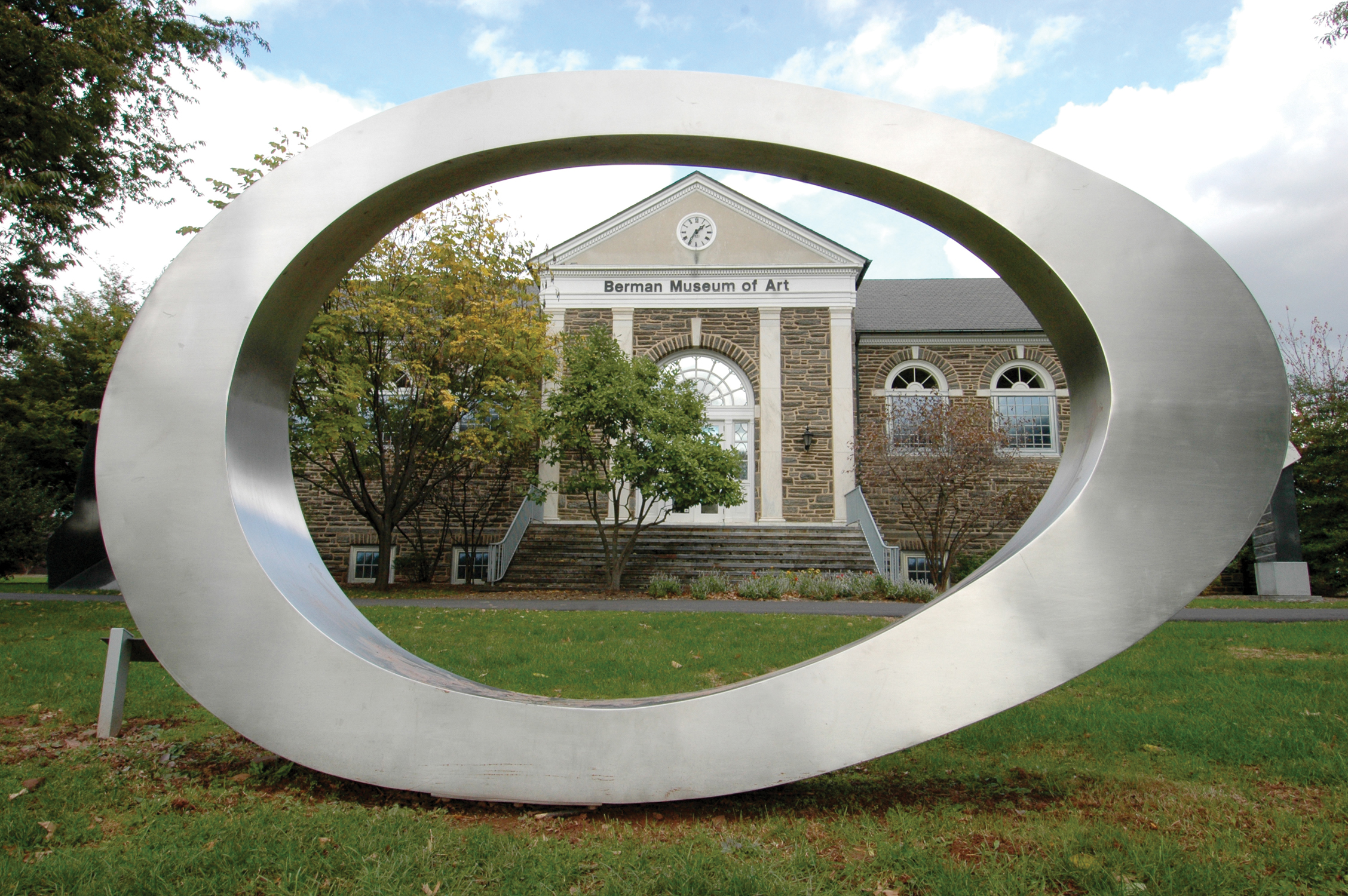 That stainless steel oval beckoning to hurdlers anchors the entire collection at Ursinus. Created by G. Noble Wagner (the “G” is for Gladys), The Oval makes an elegant and eloquent opening statement about the collection. Peer through it at just the right angle and what you have is a landscape—the tree-dotted expanse of the campus that stretches along Main Street. Take a gander through its shiny frame almost edge on and what you get is a two-story red-brick home adjacent to campus and now belonging to the college, some modest row houses across the street, and farther on a pizzeria. An art teacher and philosopher who had lived and worked in nearby Cheltenham, Wagner seems to be asking visitors to look at her art and all the art on campus from every angle.