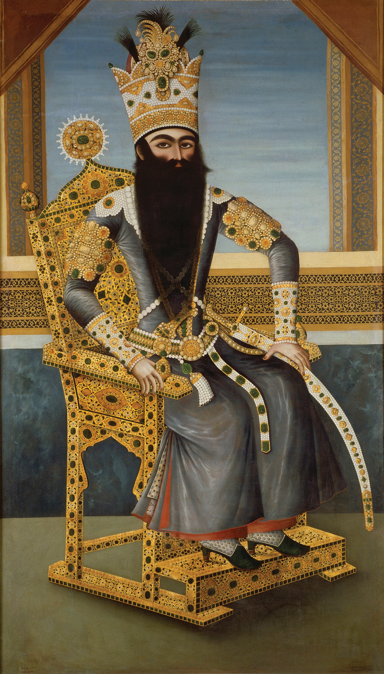 The decades-long, jewel-encrusted, one-upmanship between Kaiser Bill and Abdülhamid II, for example, served as stage dressing for an intricate political negotiation involving German military advisers and the Baghdad Railway—a web of intrigue whose fallout extended to the Armenian genocide and World War I. A radiant green velvet kaftan from sixteenth-century Iran is embossed with elaborate silver embroidery in an ornate geometric latticework studded with taboo figurative cameos—which may have been a deliberately provocative gesture when gifted by the Shah Muhammad Khudabandah to Ottoman Sultan Murad III, as it was given in the middle of a war in which Iran lost substantial territory to the Ottomans. Why send an offensive bathrobe to a foe who’s busy pummeling your armies? Plus Muhammad Shah was almost blind. What was going on here? Sometimes the negative spaces can be as compelling as the pattern itself. Two impressive, large-scale, oil-on-canvas portraits of Fath ‘Ali Shah—the ruler of Persia during the late eighteenth and early nineteenth centuries—testify to his court’s remarkable patronage of the arts, but also to his desperation to form alliances with England and France in the wake of Russia’s aggressive annexation of Georgia. The earlier of the two portraits depicting the young, uncrowned—but already extravagantly bearded—shah was a gift to the Court of Directors of the East India Company; the later depiction, showing the shah in full regalia, was presented to Napoleon. Neither country responded, and Persia lost to the Russians twice, eventually capitulating to a series of increasingly punitive treaties. When an angry Persian mob assassinated a Russian ambassador, Fath ‘Ali sent a groveling gift of eighteen precious manuscripts and his largest jewel—the 88.7 carat Shah Diamond, which remains in the Kremlin. Gifts as decorative punctuation in sweeping historical epics of passion, tragedy, and revolution. Sweet! Well, bittersweet.