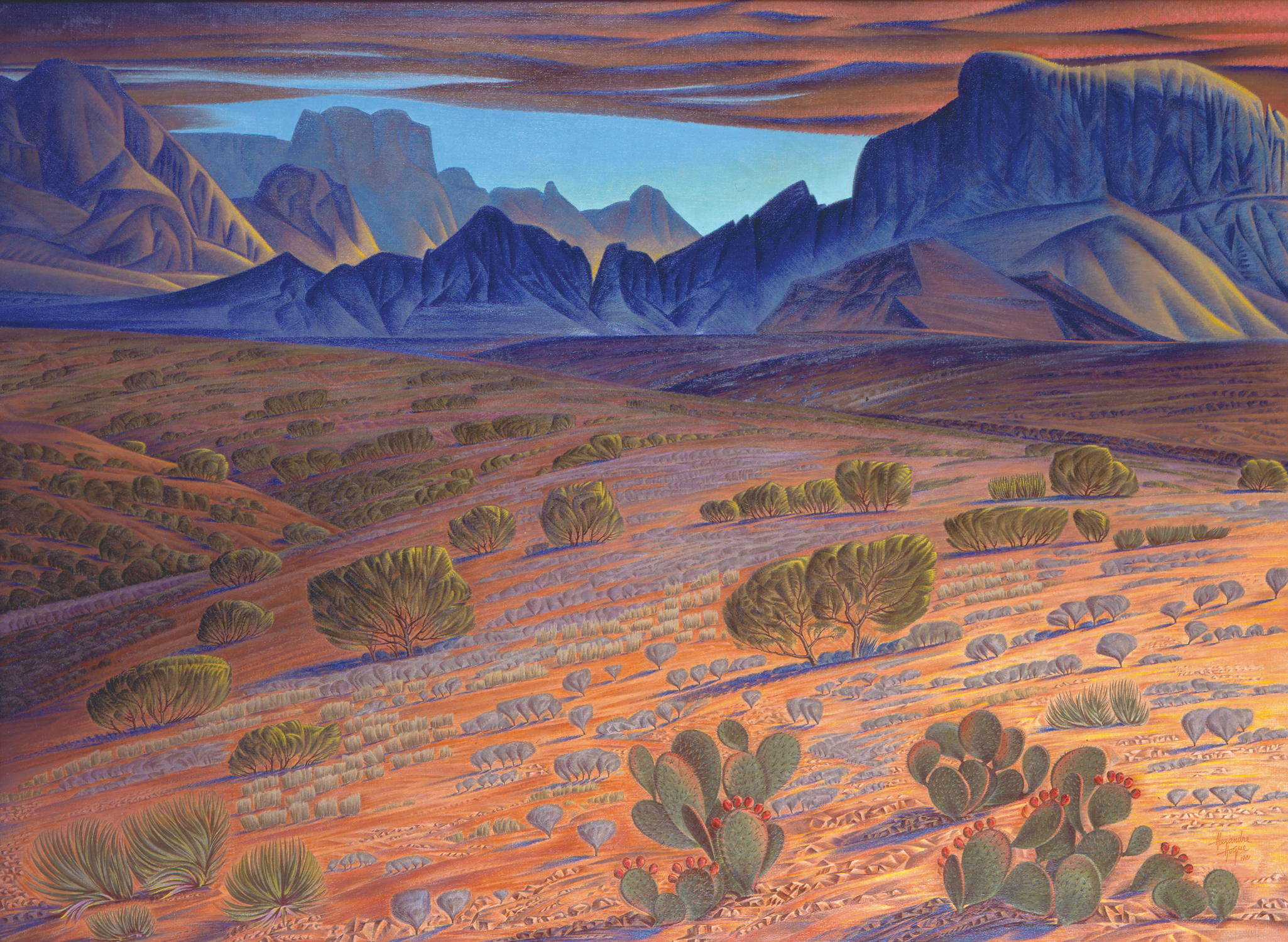 That which is truly new sometimes comes in the guise of the usual. If one doubts this premise, all that’s needed is a look at Alexandre Hogue’s landscapes, on view through August 20 at the Grace Museum in Abilene with support of Humanities Texas. Hogue’s works aren’t mere replicas of terrain. Rather, they reveal the mysterious delight that limns the interstices of hills, canyons, and rural structures. Like Ralph Waldo Emerson, whose first and primary church pew was Nature, Hogue didn’t seek to cut the transcendent from its literal “ground.”