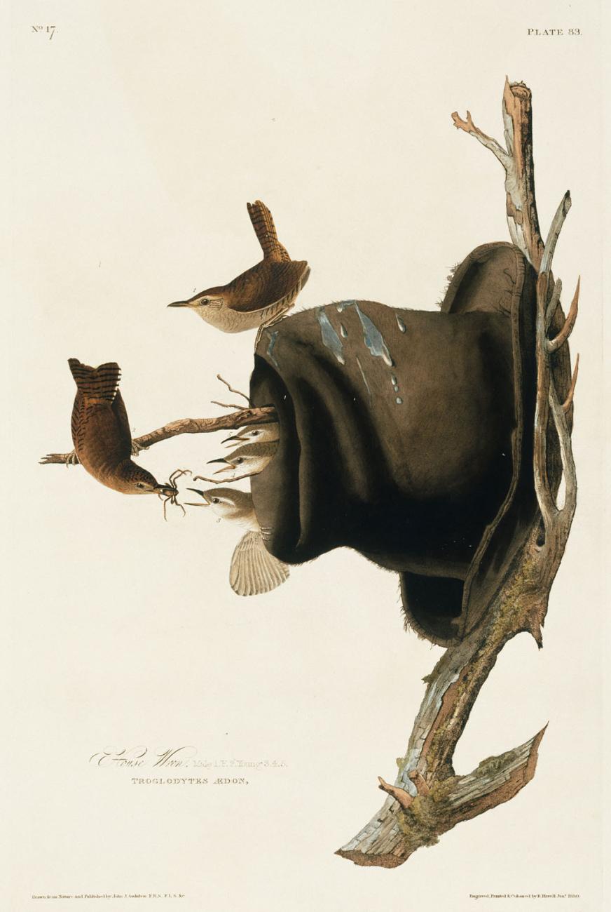 First published in England, where he had gone to find the best printer available, Audubon’s massive collection of 435 bird illustrations confronted a curious legal provision when it first appeared between 1827 and 1838. British copyright law stipulated that copies of all books containing text be deposited in crown libraries around the country, and the expense of that requirement would have fallen on Audubon. The prospect of producing so many library copies of his book was overwhelming, since the high production values of Birds of America gave each edition a whopping price tag of about $1,000 or roughly $23,000 in today’s money.