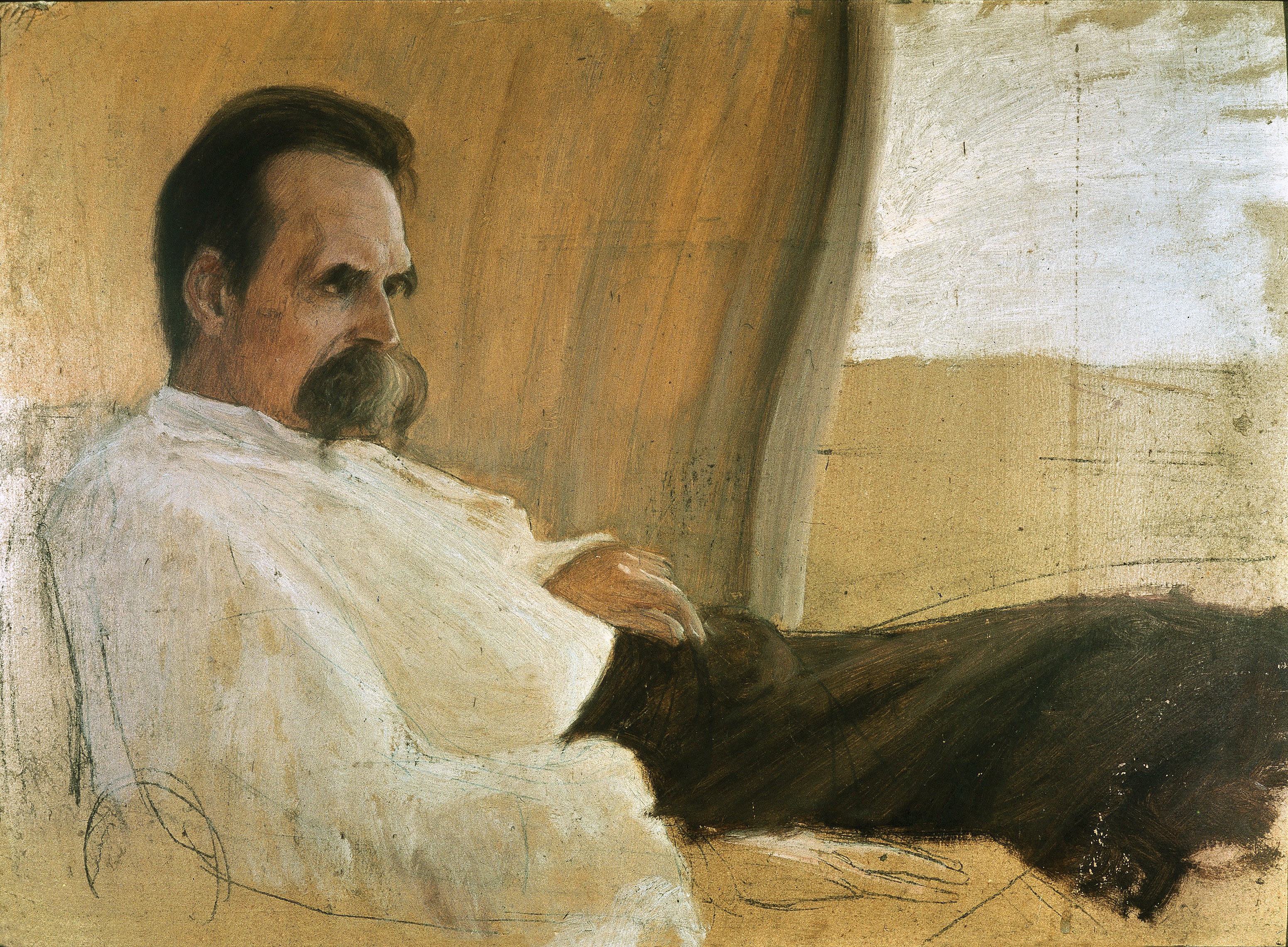 Nietzsche’s body had been laid out in a coffin lined with white damask and linen, his half-opened eyes suggesting he was merely sleeping. “His last sickness gave him a pitifully drawn and emaciated expression, but the large, puffy, frost-gray moustache hides the pain of the mouth,” observed Kessler. “And this splendid form appears everywhere through the emaciation: the wide, arched forehead, the robust, powerful jaw and cheekbone appear still more sharply under the skin than when he was alive. The total impression is one of strength despite the pain.”