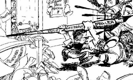 Even his political opponents could at times acknowledge Pegler’s appeal. Commenting on his influence in the upcoming 1942 Congressional elections, the liberal journalist George West wrote in the New Republic that “what we are up against is the Westbrook Pegler mind.” West accused Pegler of “giving greater aid and comfort to our domestic fascists than any other one man in the United States.” At the same time, however, West noted that “in spite of the exasperation and disgust that his column often inspires when he either shows a perverse failure to see straight or hits below the belt in true guttersnipe fashion,” he still considered Pegler “my favorite reactionary.” He intended this as more than just faint praise. “Pegler is an artist, a man of great courage, a hater of tyranny,” West explained, “and he calls the shots as he sees them.”