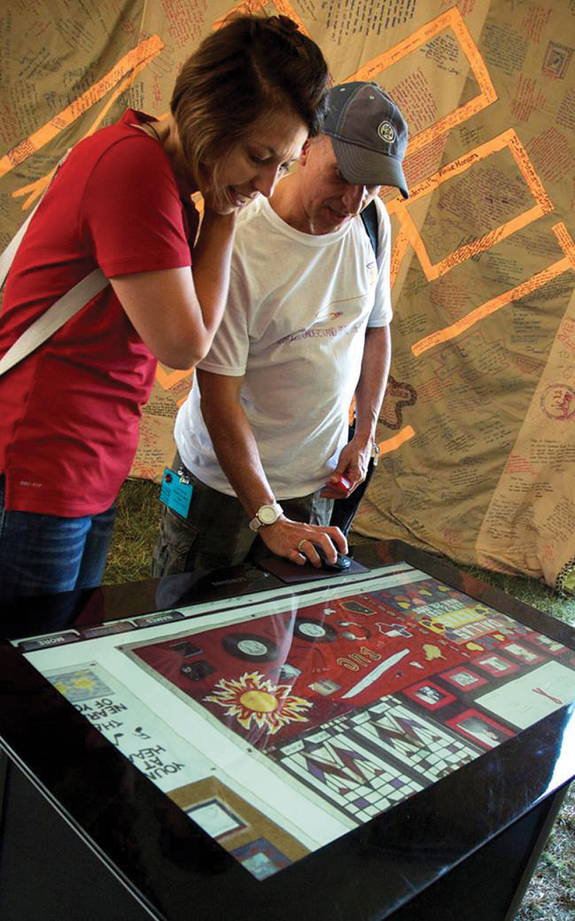 The interactive browser, which displays the quilt on a Microsoft surface, was on hand in June as the actual AIDS Quilt was laid out in its entirety on the National Mall for the first time since 1996. Tilty Table can offer either a bird’s-eye view or filter a database of AIDS Quilt images and provide results according to specific parameters. If a visitor wished to view all the panels from, say, Georgia, submitted before 2000 for males age forty and younger, they were able to retrieve that particular grouping and examine it panel by panel in a few moments, something that would have taken many hours or days to accomplish on foot.