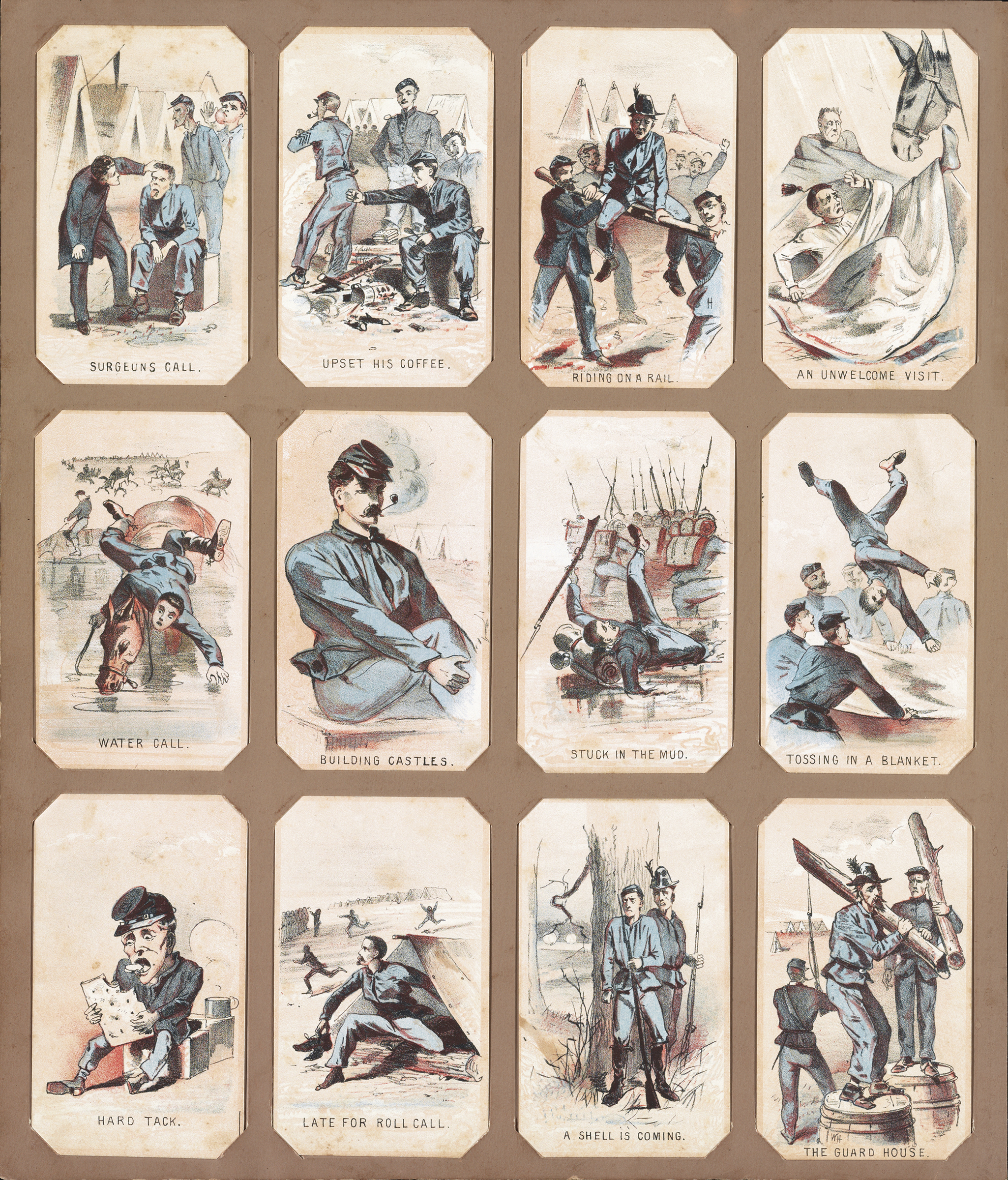 Unifying the “comical and the coffinly ”was the special domain of one artist in particular. Winslow Homer began his career by submitting illustrations of soldiers’ lives during the Civil War to weekly magazines in New York. In her study, Greenhill reconsiders “the central importance of the ‘gag’ to Homer’s dramatic sensibility.” And she asks, “If Homer was engaged in a spiritual quest, if his art spoke to embattled Gilded Age manhood, how did it arrive at a painterly idiom that encapsulated such heady concerns?” As he moved from his illustrations of humorous caricatures of soldiers to the oil painting Playing Old Soldier, Homer developed what Greenhill calls visual deadpan. And by war’s end, in the dignified Prisoners From the Front, if he “seems to expunge levity from his art, the early works are driven by an exploration of its potential to serve and inform ambitious painting.”