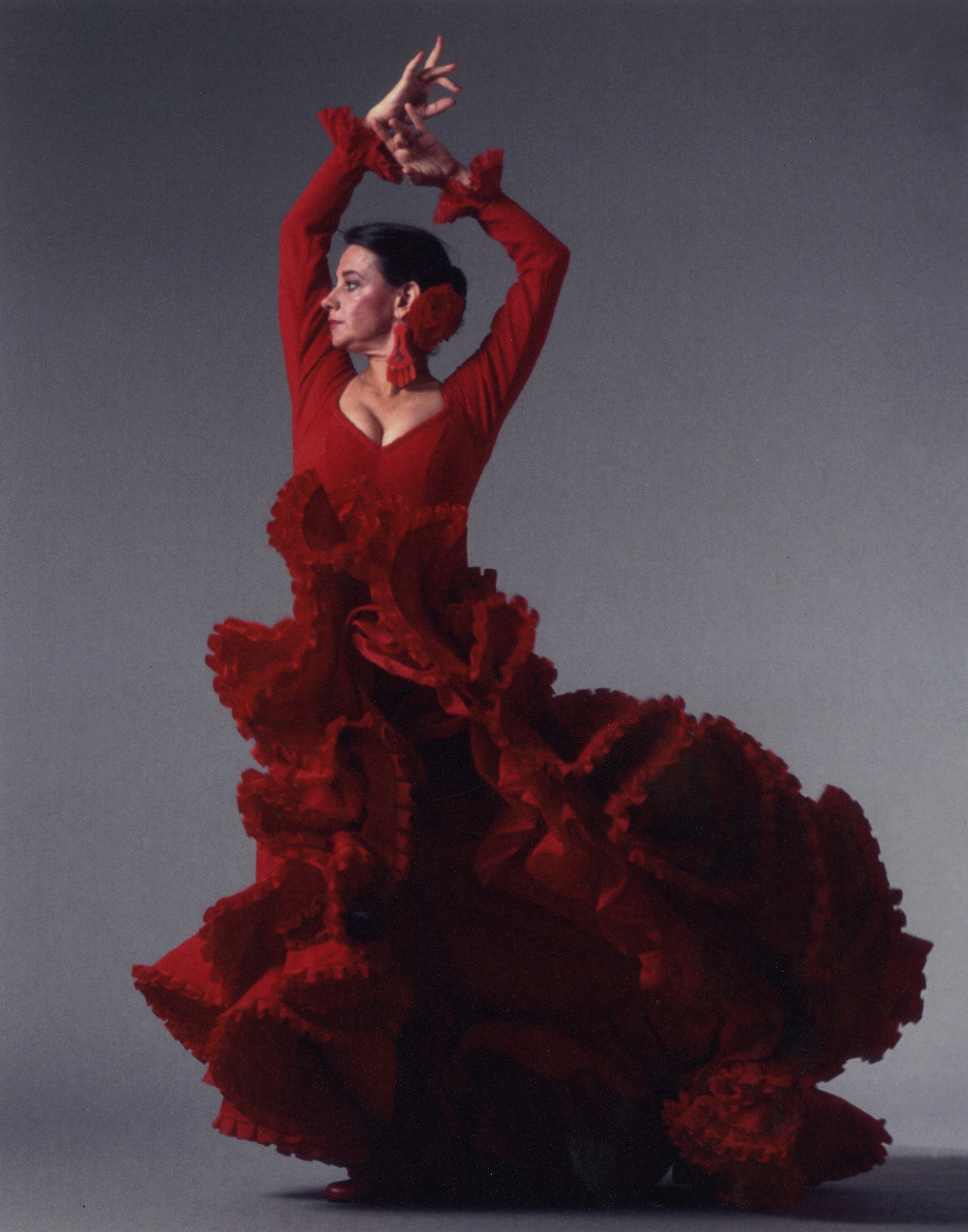Eventually, as more flamencos toured to New York or, after the outbreak of the Spanish Civil War, settled here, Spanish dance began to take root and flourish. Each performer had her own style (and at first, they were mostly women) connected to her place of origin, training, and temperament. And yet, despite the differences, they began to form a kind of family; everyone in the show seems to be connected to everyone else in some way. An example is Santana herself, captured in a photo by Victor DeLiso wearing an extraordinary blood-red, orchid-like bata de cola, flounces billowing around her like sea foam, arms held proudly aloft. (A similar dress, belonging to another dancer, appears in a glass case in the show.) The American-born Santana was a student of María Alba, née Joan Fitzmaurice, a porcelain-skinned Irish American with Broadway aspirations. After seeing a performance by Carmen Amaya in the early fifties, Fitzmaurice was so impressed that she decided to remake herself as a flamenco dancer. She took a Spanish name (María Alba), studied with Mariquita Flores, and stopped speaking English. In the show, there is a film of Alba performing a seguiriya, with exquisitely precise foot- work and a serene, mask-like face.