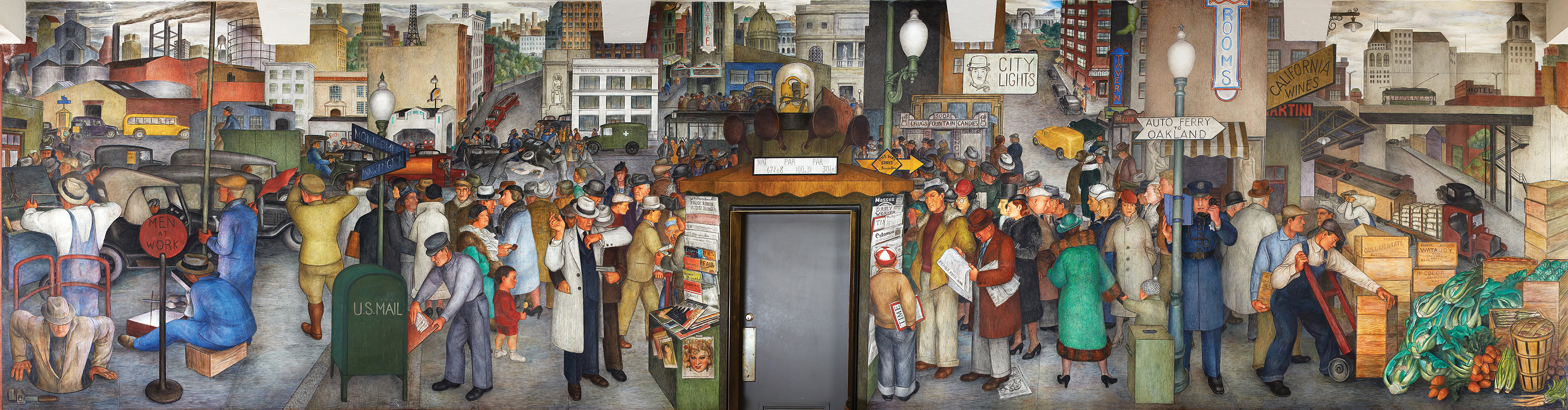 The murals were controversial at first, especially Bernard Zakheim’s Library, in which a browser’s hand is grasping a copy of Das Kapital he just pulled from the shelf. In Arnautoff ’s City Life, workers eager to buy socialist newspapers and magazines are vying with other readers at a busy kiosk. The context for these scenes was the 1934 Longshoremen’s Strike. Other characters and aspects of urban and agricultural life are shown as well, including a thug lifting a wallet at gunpoint, looming smokestacks portending industrial might, and farm laborers packing and loading produce.