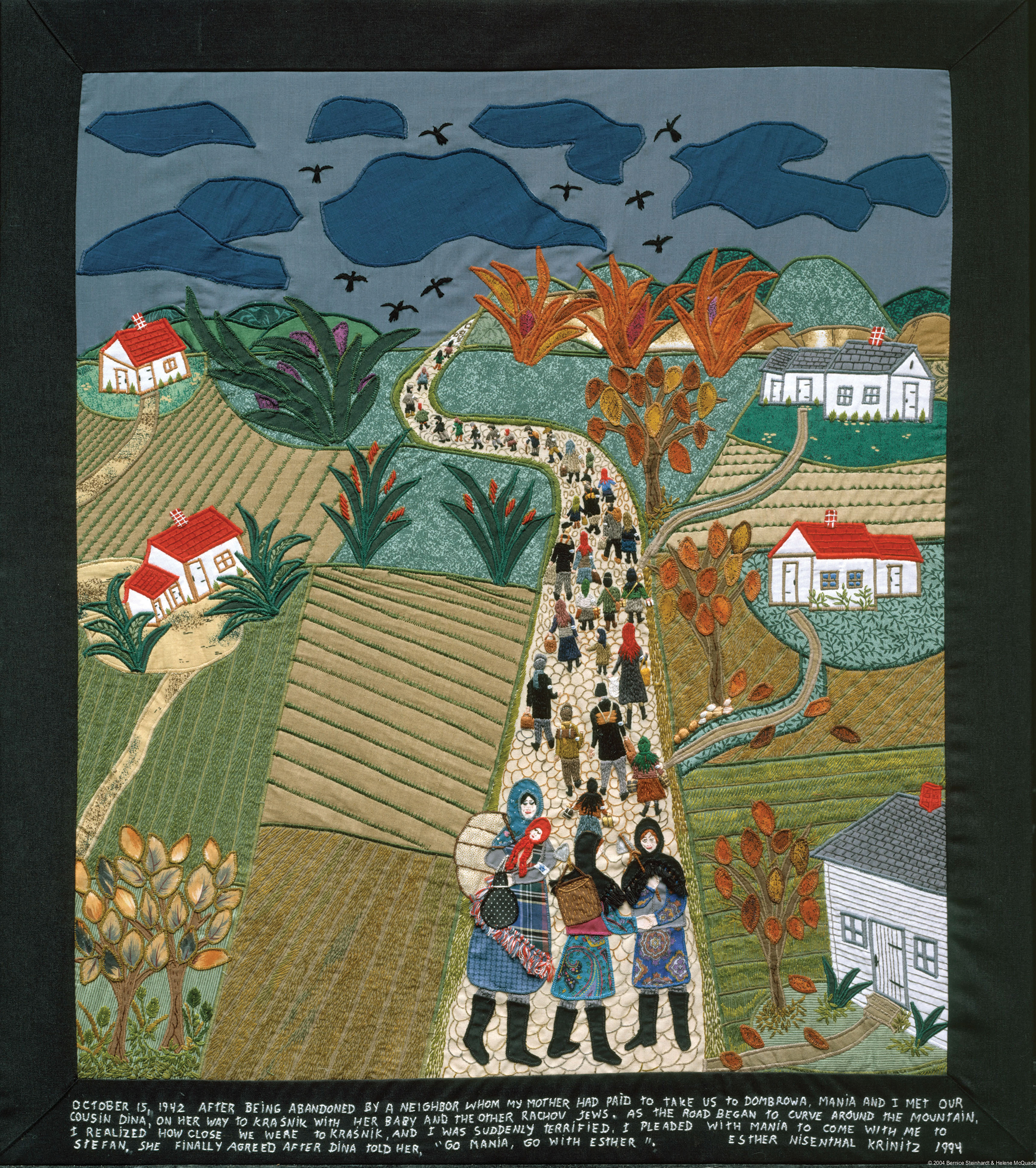 But it is to October 15, 1942, that Krinitz gave her greatest attention, creating five panels that begin with Esther and Mania saying their last goodbyes to their family, then following the girls in their paisley dresses to their ultimate destination. The road shows a sea of people—women in bright head-scarves, children carrying baskets, and men with rucksacks—becoming tinier and tinier, until they disappear over the horizon. Above their heads fly crows, birds Krinitz associated with death. In the foreground, we see Esther and Mania parting again from loved ones. This time, it is their cousin, Dina, with her red-hooded baby in her arms.