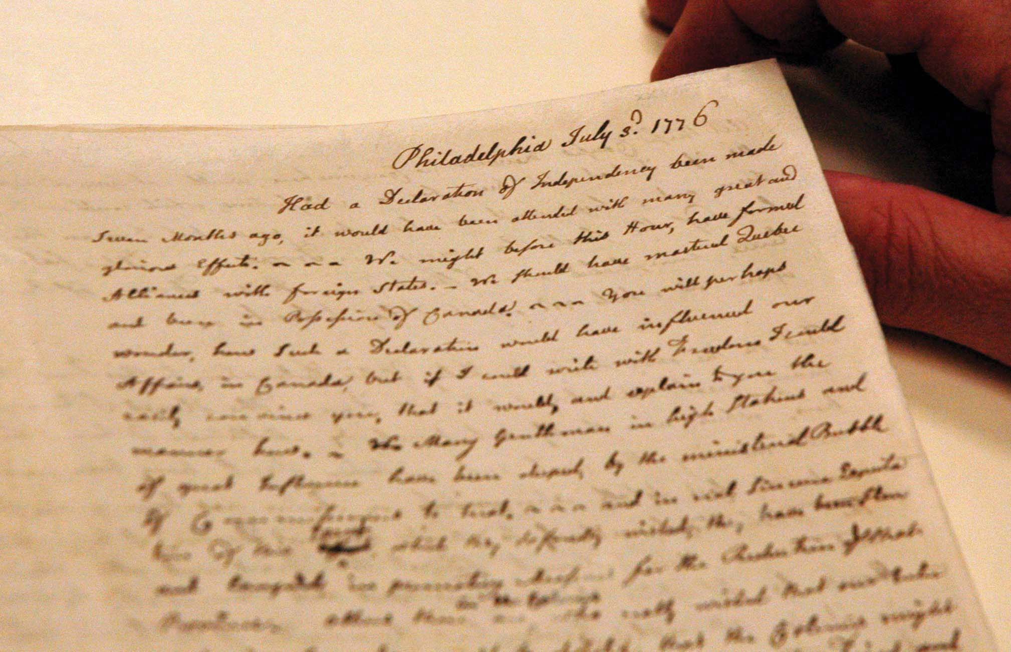 Drummey encouraged me to read aloud the letter from John, dated July 3, 1776, in which he discussed the momentous events of the previous day. “Adams thinks that July 2, the day they voted for independence, will be the one celebrated for generations to come, not when it was publicly declared,” he said. “When this letter was written on July 3, the Declaration had already been drafted and approved—but it had not yet been set in type or printed. So here you have a person who is on the committee to write the Declaration of Independence, he’s a direct participant, and what is most remarkable about this letter is that he predicts precisely the way the day will be remembered—only he’s got the exact day wrong.”