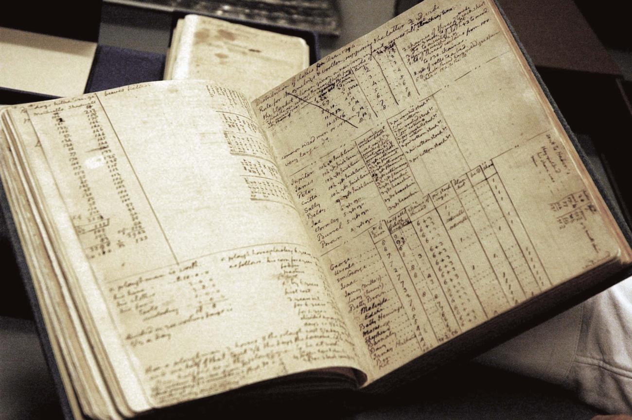 We began with a journal Jefferson kept on beautifully made rag paper that bears no formal title but is cataloged by the society as Thomas Jefferson’s Farm Book, a generic way of identifying what is essentially a record of the minutiae that went into the operation and management of a considerable Southern estate—some 10,600 acres, according to the journal—from 1774 to 1824. How many hogs may have been slaughtered in a certain month, whatever repairs had to be made on the outbuildings, provisions that were purchased and the amounts paid, all the plowing, sowing, planting, and cutting activities that were performed, the crop forecasts, and the harvests realized—all are part of the seasonal chronicle.