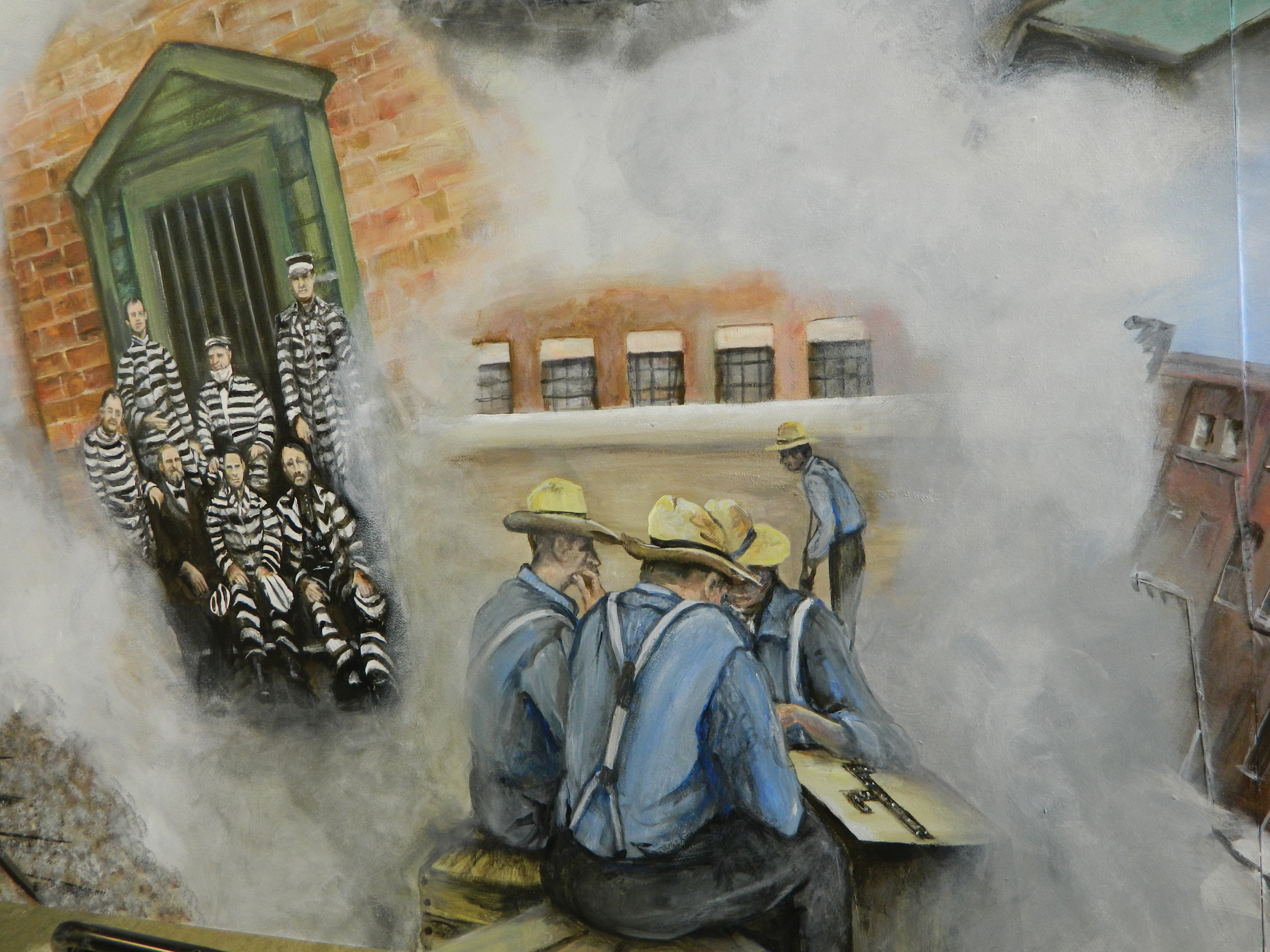 The painters drew directly from historical photographs, working from as many as twenty images for each vignette that wasn’t directly copied. The smaller murals include depictions of a wagonload of prisoners arriving at the original wooden structure, a chain gang laboring in a field under the watchful eye of a guard, and the prison baseball team posing for a group portrait. The largest of these composite images, eighteen-feet in length, depicts the prison during its heyday. The beautiful administrative building—designed by Elijah E. Myers, the same architect responsible for three state capitols—spreads behind a verdant lawn where townspeople gathered to hear the prison band. Smokestacks from the factories housed within the prison’s walls loom in the background.