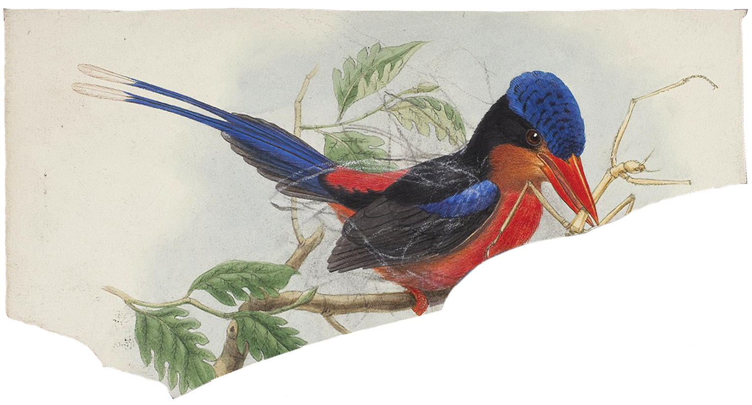 Bird artist John Gould captured the essence of his avian subjects with quick, bold lines, but his great success was due to more than a good drawing hand. Just as important was his manner of production, which yielded an incredible fifty oversized volumes between 1830 and 1881. First, Gould would make a rough sketch, jotting notes on the manuscript as to how to fill out the picture and which colors to add, then pass the image on to other artists and colorists, including his wife, Elizabeth, and Edward Lear, who provided the finishing touches. His beautiful drawings assured his popularity among a wealthy clientele, while the reliable scientific information in his tomes made for a wider commercial success.