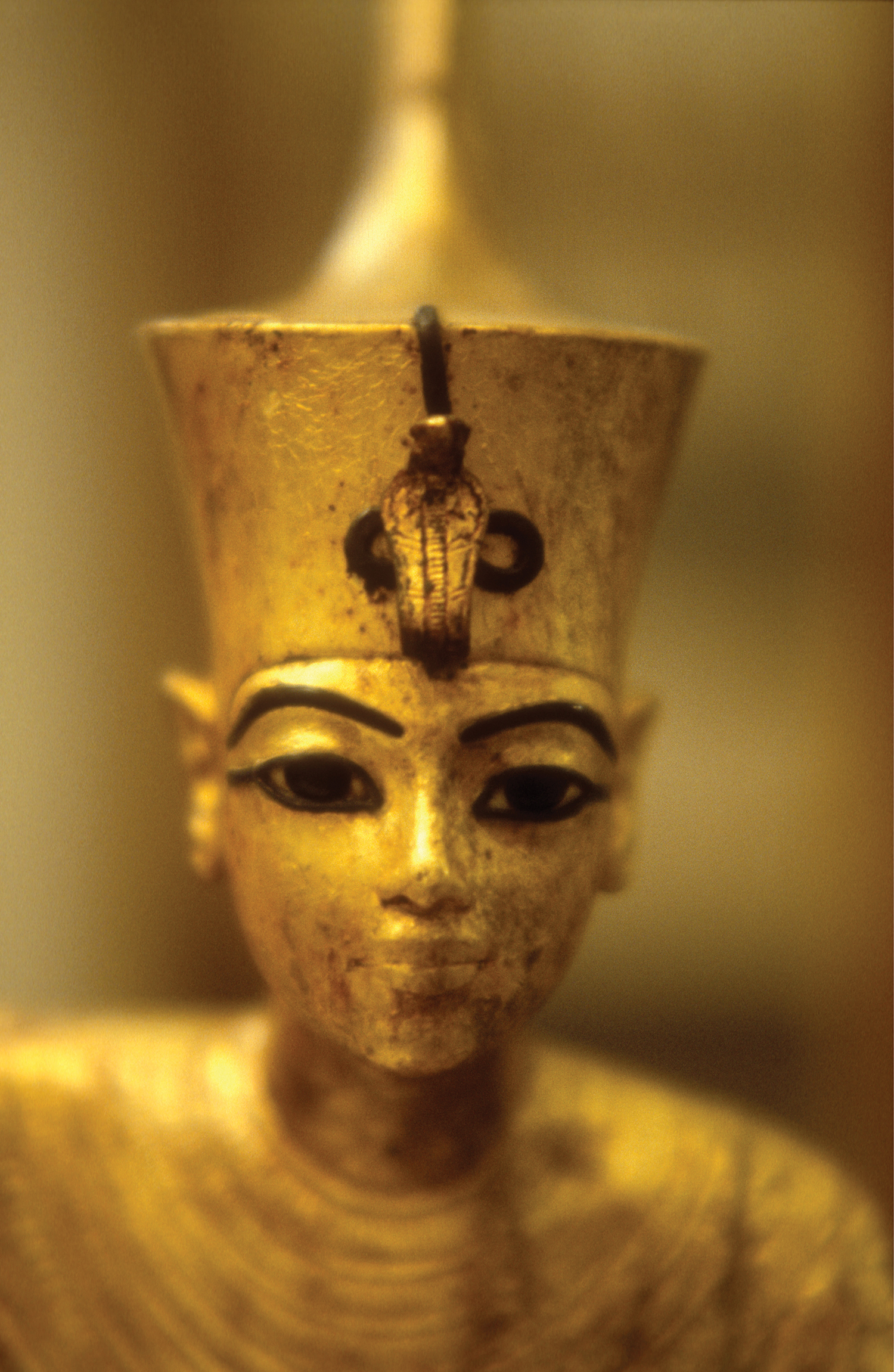 When Carter opened Tut’s sarcophagus, he found three coffins, one nestled inside the next. Tut’s mummified body lay in the final coffin, a funeral mask covering his head and upper body. The mask, which for all of its golden glitz makes it seem as if the boy-king still lives, has become synonymous with Tut. Obsidian and quartz create his soulful eyes, while lapis lazuli sketches his eyelashes and eyebrows. A fake beard appears below his full lips, its plaits crafted from the same deep-blue glass as the stripes in his headdress. As a vulture springs forth from Tut’s brow, signifying his dominion over Upper Egypt, a cobra puffs up beside it, proclaiming Tut’s sovereignty over Lower Egypt. A wide collar inlaid with green feldspar, lapis, and quartz covers his chest, swooping up to finish with a falcon’s head perched on each shoulder.