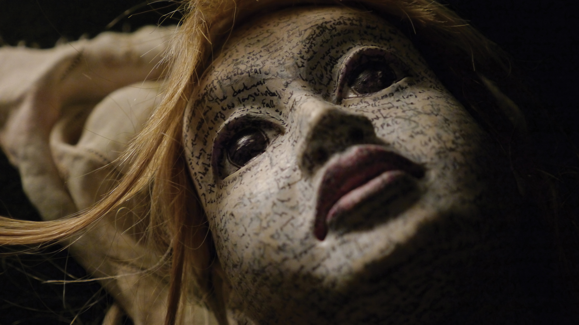 The little match girl is a life-sized puppet on whose face is written the Andersen story, mimicking the Bunraku tradition of adhering scraps of old scripts to carved puppet heads to protect them. But Farrell didn’t think that was quite right for the little match girl. “I wondered what it would look like if I took this white face and handwrote the entire story onto it. Which, for me, felt like a way of turning her life into metaphor—her being is marked by the story itself.” Farrell admits, “I knew it wasn’t going to be seen by the audience, so why bother? I don’t know. There is something magical about her carrying that with her.”